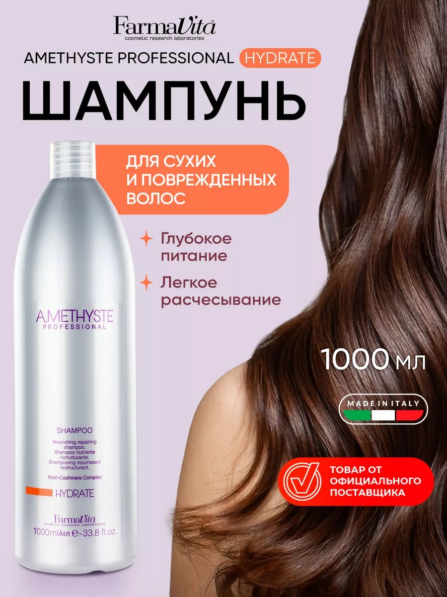 The professional moisturizing shampoo AMETHYSTE HYDRATE SHAMPOO from Farmavita is designed for dry, damaged, and weakened hair.