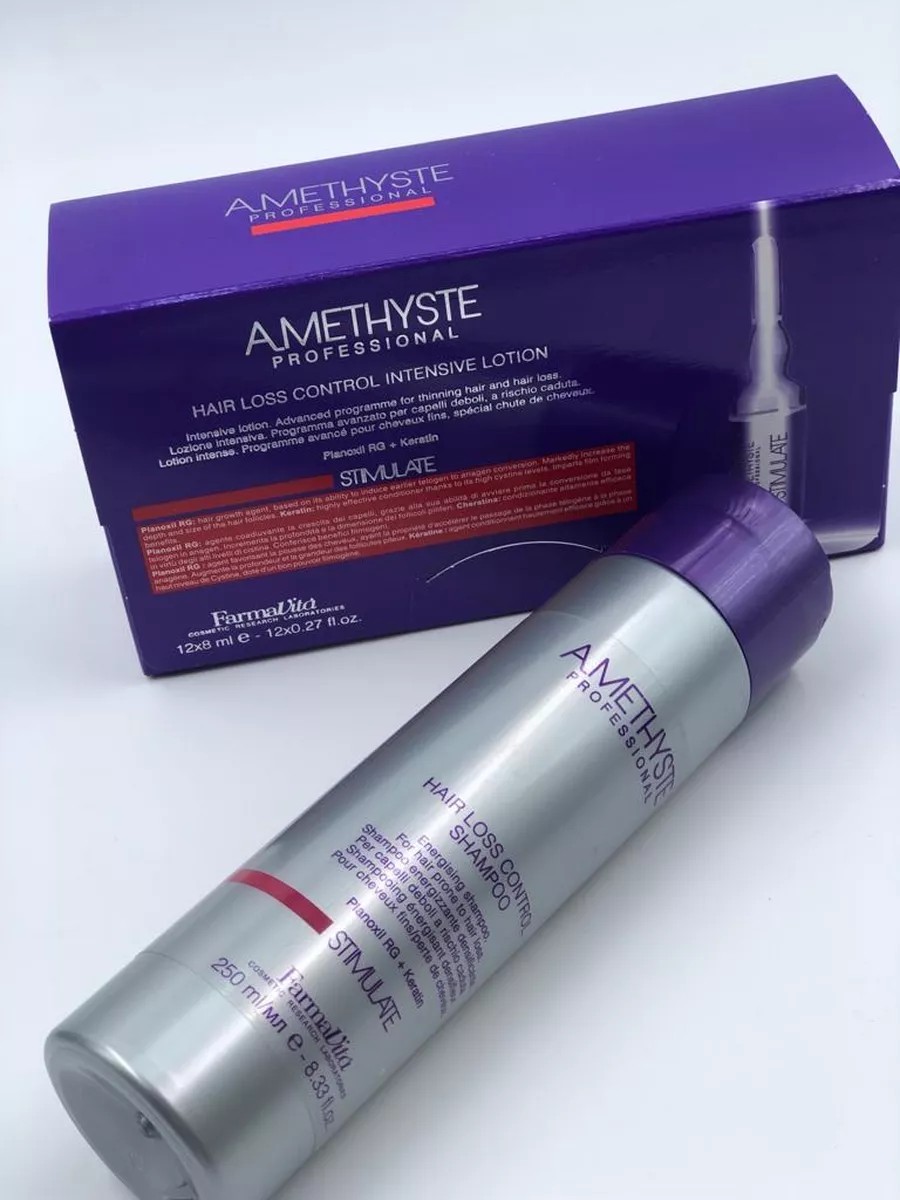Шампунь профессиональный 250 мл для укрепления, против выпадения, для роста волос AMETHYSTE STIMULATE HAIR LOSS CONTROL.+ укрепляющие ампулы для для волос, несмываемый лосьон на кожу головы AMETHYSTE Stimulate Hair Loss Control Intensive Lotion.Энергетический шампунь для придания силы и укрепления тонких и выпадающих волос. Оказывает стимулирующее воздействие на кожу головы. Волосы становятся более объемными, плотными и густыми.Planoxil RG: Является агентом роста волос, обладает способностью вызывать ранние преобразования Телогена (фаза покоя волоса ) в Анаген (фаза активного роста волоса). Заметно увеличивает глубину и размер волосяных фолликулов.Кератин:Чрезвычайно эффективный кондиционер за счет содержания цистина. Создает защитный пленкообразующий эффект. Обеспечивает длительный эффект и придает естественный блеск.Не содержит: Синтетических красителей. Веществ животного происхождения. ГМО.AMETHYSTE Stimulate Hair Loss Control Intensive Lotion. Продвинутая программа для ухода за ослабленными волосами. Формула средства включает в себя Planoxil RG и Кератин, которые оказывают стимулирующее воздействие на волосяной покров. Волосы снова становятся густыми, объемными и плотными. Способ применения: вымыть волосы шампунем Amethyste Stimulate. Используя аппликатор, открыть флакон и нанести содержимое непосредственно на кожу головы, по проборам. Помассировать. Интенсивный лосьон с Planoxil RG и кератином оказывает стимулирующее действие на фазы роста волос. Через 2,5- 3 месяца применения программы "Stimulate" волосы снова становятся густыми, объемными и плотными. Восстанавливают волосы после гормонального сбоя, после родов, после стресса, после заболевания.