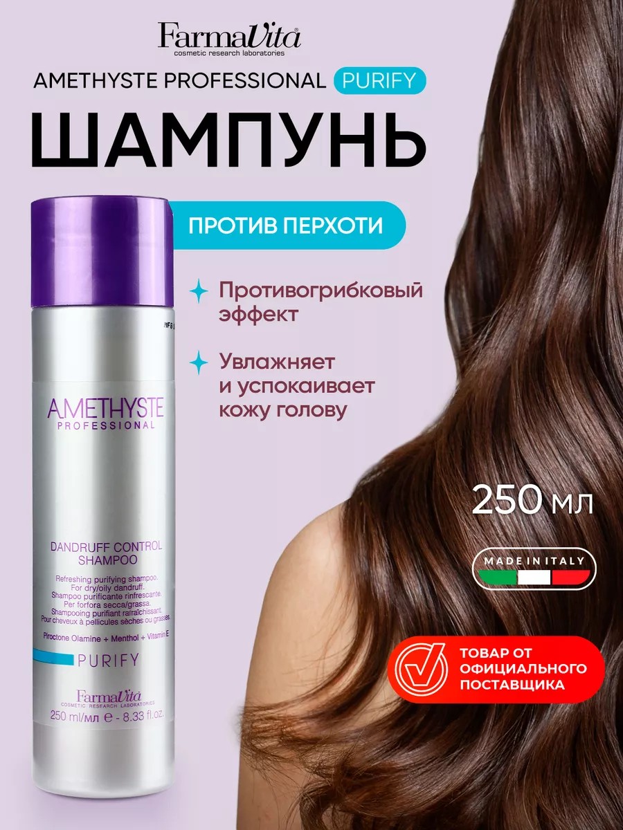 Витамин Е: природный антиоксидант, способствует увлажнению, восстановлению и укреплению волос. Шампунь от перхоти профессиональный подходит как для женщин, так и для мужчин. Объём 1000 мл и 250 мл, подходит для ежедневного применения. Для эффективного удаления перхоти и предотвращения ее появления используйте шампунь совместно с пилингом Amethyste Purify Peeling Mask