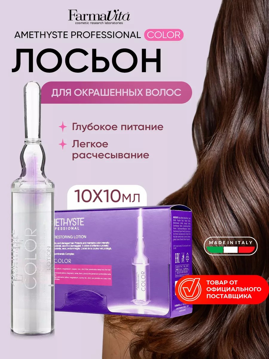 Лосьон в ампулах для окрашенных волос AMETHIST Proffessional Color - это салонная программа для профессионального и домашнего ухода за волосами после окрашивания, а также для сухих и ломких волос. Лосьон обеспечивает интенсивное восстановление поврежденных волос после окрашивания, осветления и других воздействий на волосы.