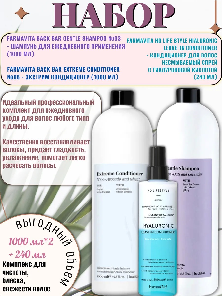 Шампунь для ежедневного применения 1000 мл увлажняющий Gentle 03 Back Bar, Фармавита и Кондиционер для волос 1000 мл Extreme 06, двухфазный спрей дя волос для легкого расчесывания. Профессиональный шампунь с кератином для глубокой очистки волос борется с ломкостью и придает объем у корней. Благодаря балансу ph5.5 очищает так же деликатно, как бессульфатные аналоги. В отличие от средств без сульфатов, хорошо пенится за счёт мягких ПАВов. Универсален для мужских, женских, окрашенных, кудрявых и жирных волос. Не вымывает пигмент и препятствует желтизне блонда — лучший выбор для блондинок с осветленными и мелированными прядями.