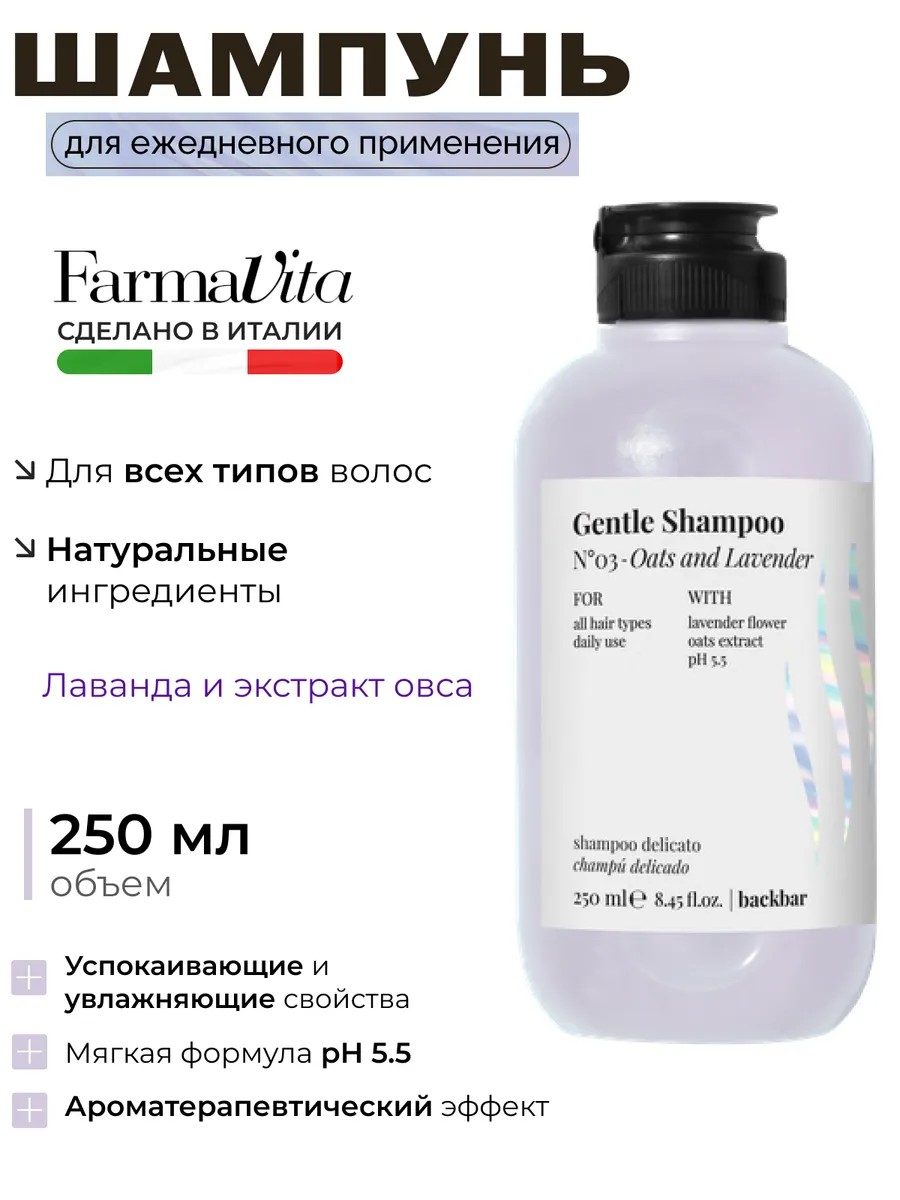 | Полное наименование товара | Back Bar Gentle Shampoo Шампунь для ежедневного применения ph 5.5 с экстрактом лаванды № 03 250 мл 107176 |