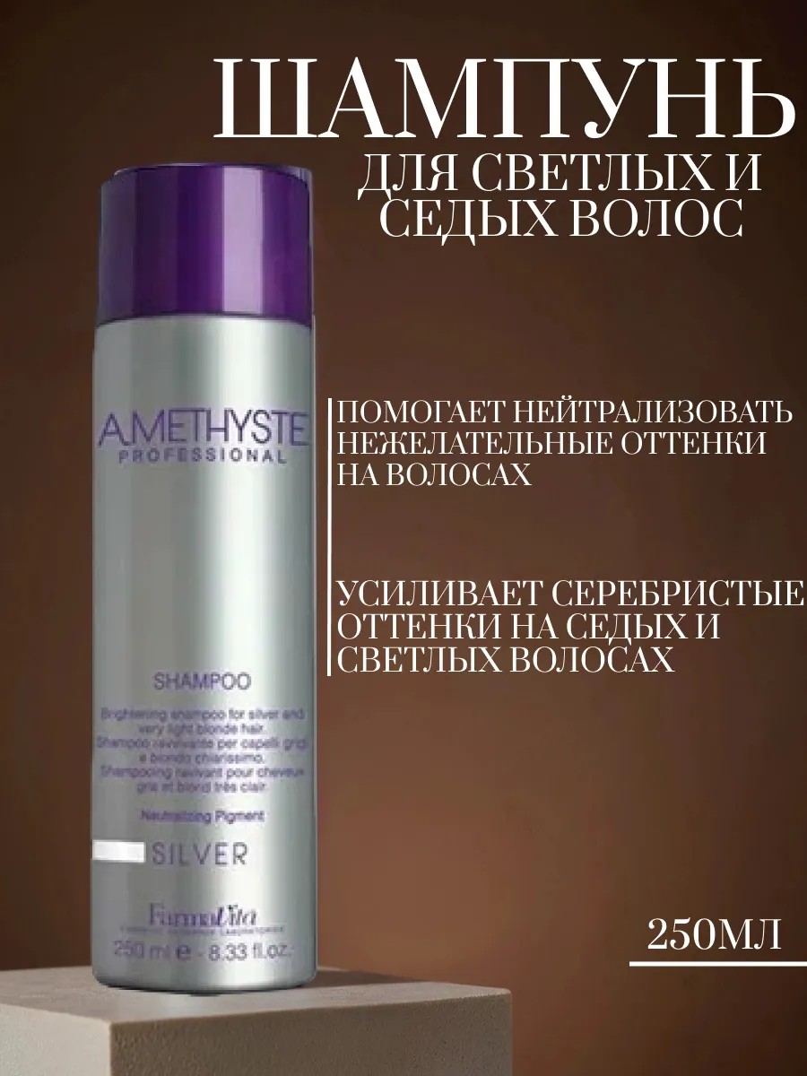 Шампунь AMETHYSTE SILVER SHAMPOO. Осветляющий шампунь для седых и светлых волос. Мягко очищает волосы и нейтрализует желтый оттенок. Придает яркий блеск и подчеркивает осветленные пряди. Нейтрализация пигментаАнти-желтые пигменты уменьшают нежелательные желтые оттенки на предварительно осветленных, седых и затонированных волосах.