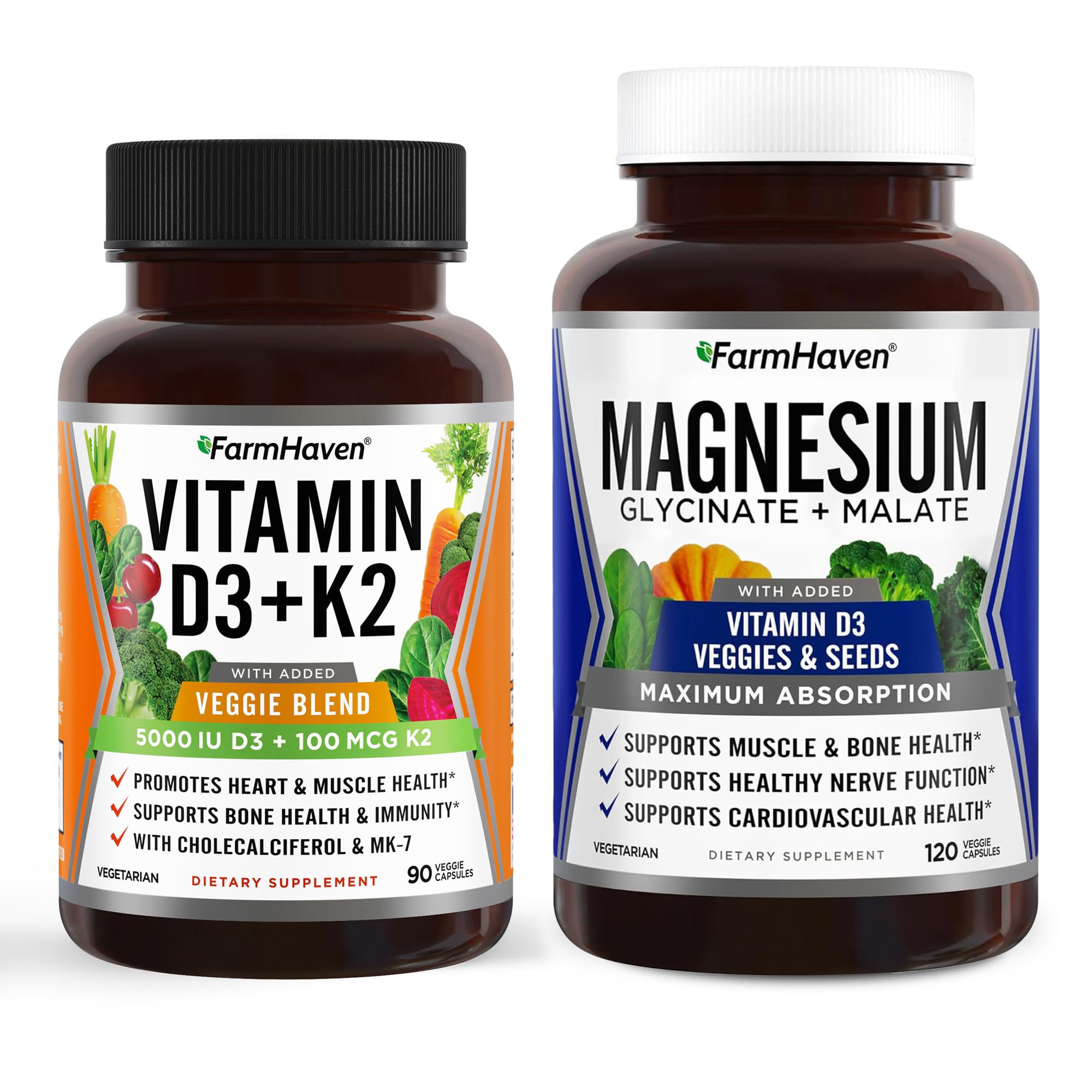 D3 And K2 For Calcium Absorption: Vitamin D3 supports calcium absorption while K2 helps direct calcium to teeth and bones throughout the body. Both work together for healthy bones and proper absorption. . Combine With Magnesium For Ultimate Health Boost: Vitamin K2 D3 goes perfectly with FarmHaven Magnesium Glycinate Malate since most people don't get enough of these 3 essential nutrients. When taken together, all of them support heart health, and an overall healthy immune system. . PROMOTES HEALTHY MUSCLES: We use non-buffered chelated magnesium that's high absorption . Magnesium plays a role in nerve function to help with muscles . MAX ABSORPTION MAGNESIUM VITAMIN D3: Our magnesium pills combine 250mg of magnesium Glycinate Malate, 800 IU of Vitamin D3, and magnesium-rich veggies like spinach in easy-to-swallow capsules. Magnesium works perfectly with Vitamin D3 to support healthy muscles, strong bones, and more without any laxative effect. .