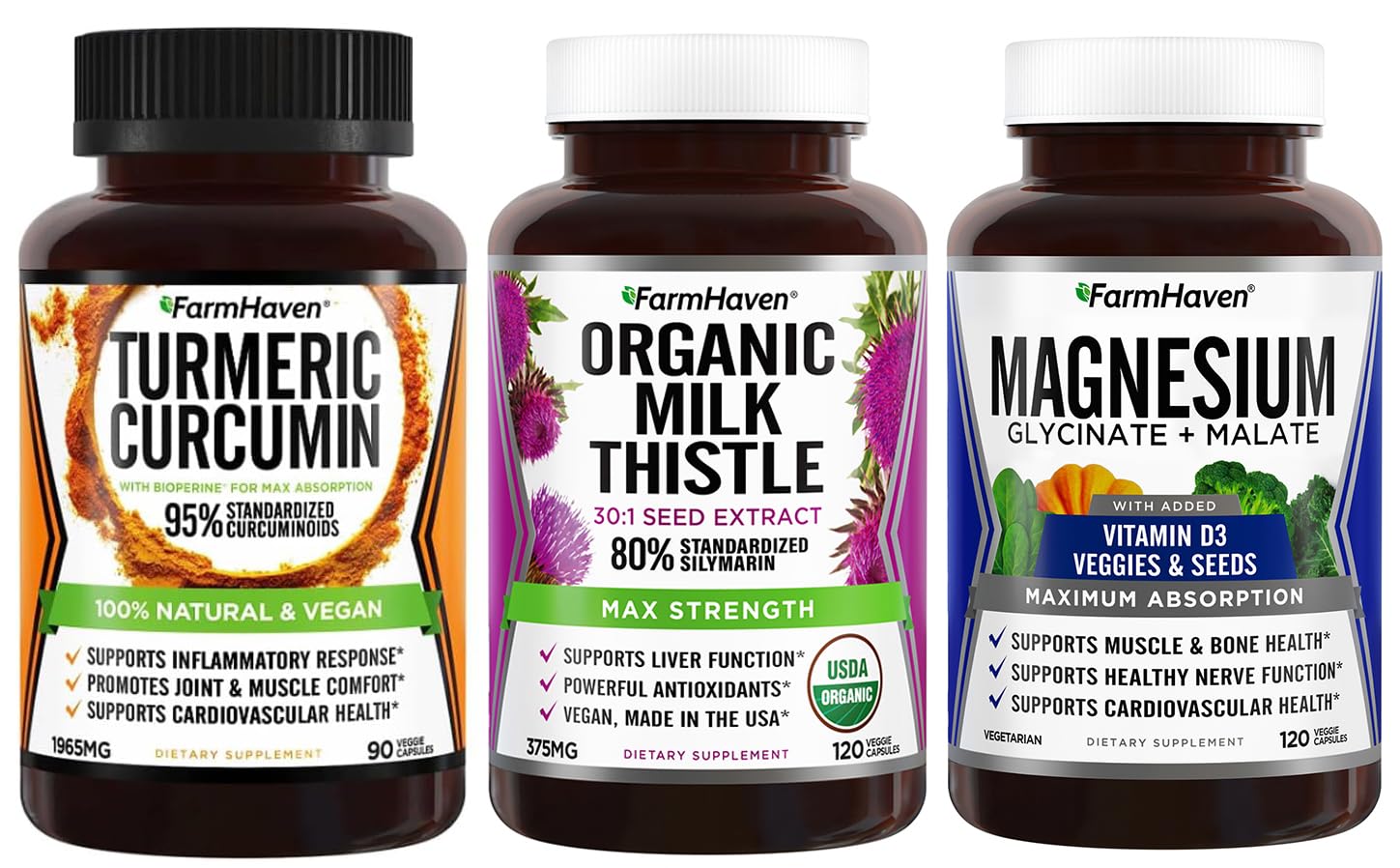PROMOTES HEALTHY MUSCLES: We use non-buffered chelated magnesium that's high absorption and not diluted with cheaper forms like magnesium oxide. Magnesium plays a role in nerve function to help with muscles. . MAX ABSORPTION MAGNESIUM VITAMIN D3: Our magnesium pills combine 250mg of magnesium Glycinate Malate, 800 IU of Vitamin D3, and magnesium-rich veggies like spinach in easy-to-swallow capsules. Magnesium works perfectly with Vitamin D3 to support healthy muscles, strong bones, and more without any laxative effect. . POWERFUL 1965MG TURMERIC BLEND: While other turmeric products may use mediocre and ineffective ingredients, FarmHaven's Turmeric Curcumin supplement lovingly delivers a blend of pure turmeric curcumin powder and 95 standardized curcuminoids turmeric extract. Each serving packs 1, 965mg (one of the highest totals) of potent turmeric goodness optimized to help you live a healthy and active lifestyle! . HIGH QUALITY SILYMARIN CONTENT: FarmHaven has formulated highly potent Milk Thistle (silybum marianum) capsules containing extract that is standardized to 80 Silymarin flavonoids, the "good stuff" in Milk Thistle. This means each capsule contains 300mg of pure Silymarin.