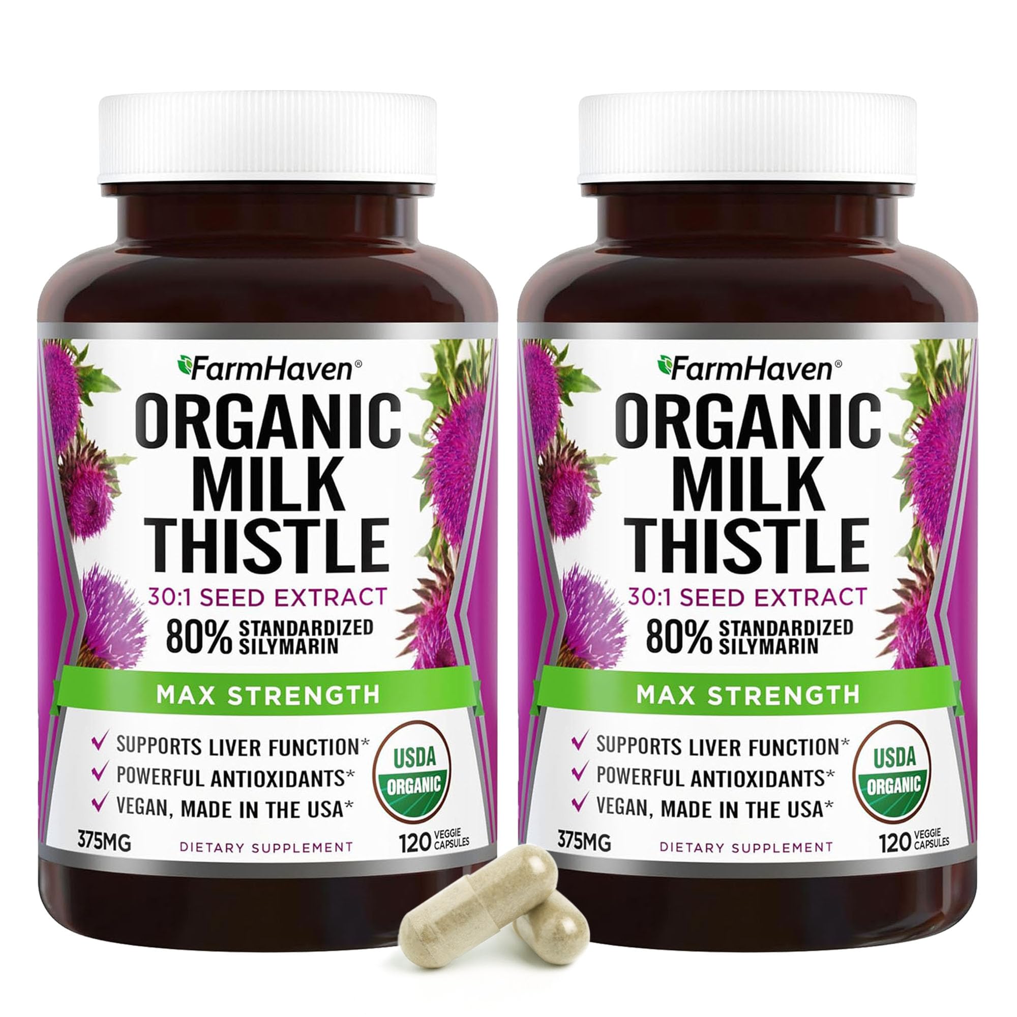VEGAN, MADE IN USA: Our product is vegan, non-GMO and free of gluten, corn, soy, preservatives, and any artificial ingredients. We utilize plant-based veggie capsules and manufacture in the USA in an NSF-Certified facility to ensure safety and purity. SUPPORTS HEALTHY SKIN MORE: Milk Thistle has beneficial properties that may help support healthy skin, promote proper digestion, and promote a natural immune response. SUPPORTS HEALTHY LIVER FUNCTION: The Silymarin found in Milk Thistle provides a natural way to support healthy liver function. Silymarin helps support cell health and function. POTENT 30:1 CONCENTRATION: FarmHaven's seed extract content means you're choosing a high strength and high purity product that's also good for the earth. Our Milk Thistle capsules contain a 30:1 concentrate extract for improved bioavailability and absorption. HIGH QUALITY SILYMARIN CONTENT: FarmHaven has formulated highly potent Milk Thistle (silybum marianum) capsules containing extract that is standardized to 80 Silymarin flavonoids, the "good stuff" in Milk Thistle. This means each capsule contains 375mg of pure Silymarin.