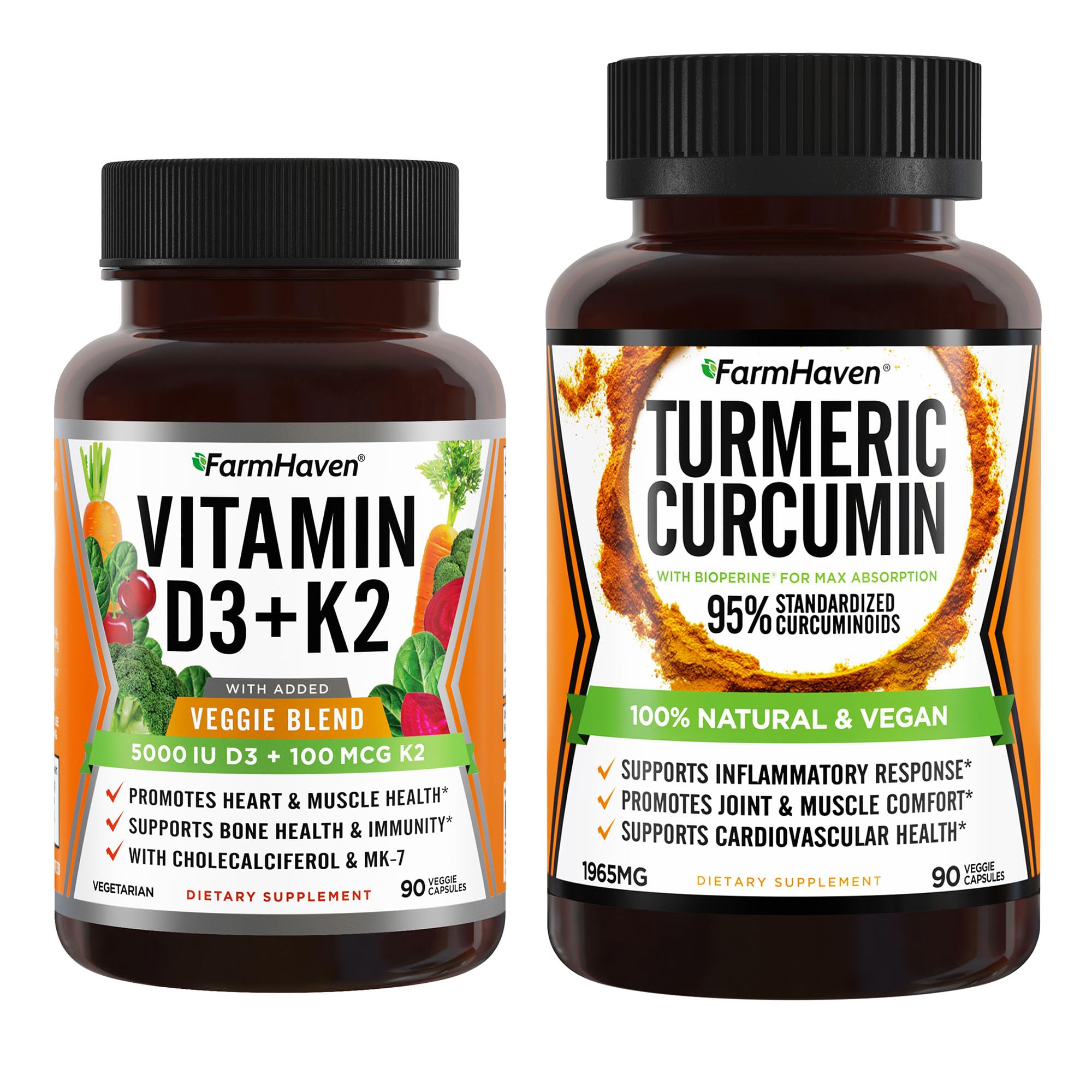 Made In USA Vegetarian: Our D3 and k2 supplements are manufactured in the USA in an NSF-Certified facility to ensure safety and purity. Every batch of this K2 D3 vitamin supplement goes through multiple testing stages so you know it's a clean and pure product. It's also vegetarian, non-GMO and free of gluten, corn, soy, preservatives, and any artificial ingredients. We utilize plant-based veggie capsules. High Absorption Types Of D3 And K2: Each veggie capsule contains 5000 IU of vitamin D3 in cholecalciferol form and 100 mcg of Vitamin K2 in MK-7 form. Cholecalciferol is the same Vitamin D that our bodies get from the sun, so it's absorbed quickly by our bodies. MK-7 is the best absorbed form of Vitamin K and stays longer in our bodies. . ALL-NATURAL JOINT SUPPORT: Turmeric Curcumin is the "golden herb" that has been used for centuries to support healthy joints from your neck down to your knees and feet. Our Turmeric Curcumin formula naturally promotes joint comfort and exercise. Turmeric supports your active lifestyle and helps increase general overall wellbeing. . MADE IN USA, NON-GMO, VEGAN: FarmHaven products are all natural and made in the USA in an NSF-Certified cGMP facility, so you can be confident of the quality. We utilize plant-based veggie capsules and do not use any magnesium stearate to produce our turmeric capsules. Our formula is vegan, Non-GMO and free of gluten, corn, yeast, soy, dairy, preservatives, and any artificial ingredients. . POWERFUL 1965MG TURMERIC BLEND: While other turmeric products may use mediocre and ineffective ingredients, FarmHaven's Turmeric Curcumin supplement lovingly delivers a blend of pure turmeric curcumin powder and 95 standardized curcuminoids turmeric extract. Each serving packs 1, 965mg (one of the highest totals) of potent turmeric goodness optimized to help you live a healthy and active lifestyle! .