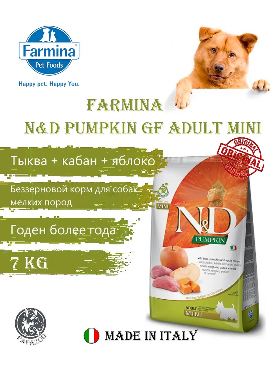 Farmina N&D Pumpkin GF Adult Mini (Pumpkin, Boar, Apple) is a balanced grain-free food for adult small breed dogs.