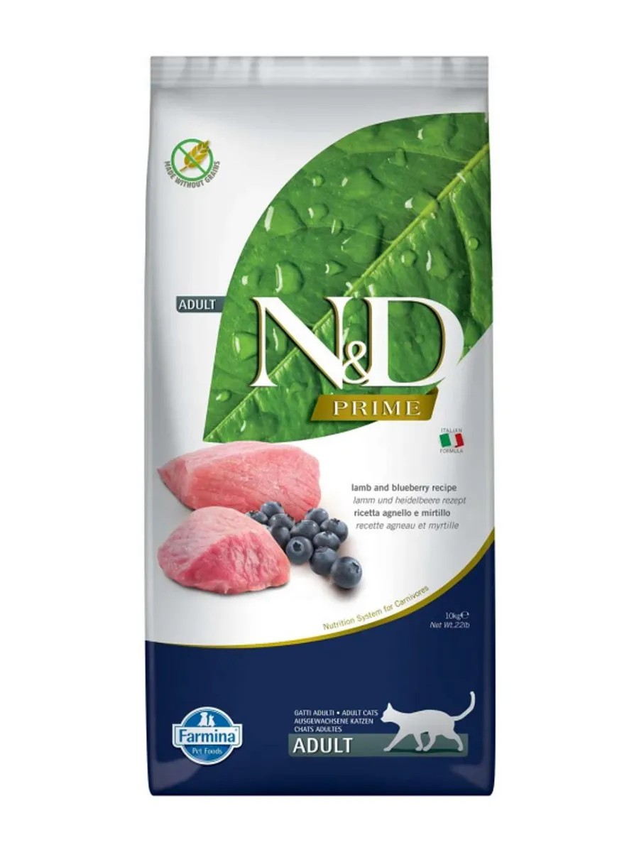 Полнорационный беззерновой сухой корм для взрослых кошек Farmina N&D Prime Ягненок и Черника - это вкусный и полезный выбор для вашей кошки.