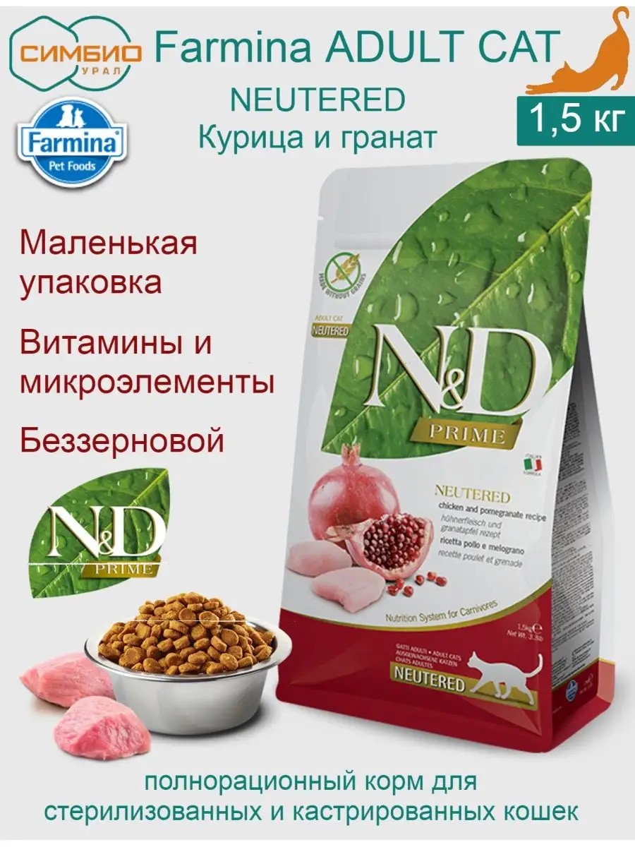 Farmina N&D CAT Chicken & Pomegranate Adult Фармина Курица с гранатом - полнорационный беззерновой корм для взрослых стерилизованных кошек и кастированных котов Линейка Natural&Delicious (N&D) производства итальянской компании Farmina Pet Foods преимущественно из итальянских ингредиентов.Почему БЕЗЗЕРНОВОЙ? Эволюционно и собаки, и кошки - это хищники, их анатомия такова, что диета должна по сути быть плотоядной. От диких предков нашим домашним любимцам досталось 99,8% генетического кода. У них есть: острые зубы, чтобы рвать мясо; мощный нижнечелюстной сустав, который позволяет широкого открывать рот для заглатывания больших кусков мяса. Пищеварительная система обеспечена сильно кислым желудочным рН, для быстрого переваривания и метаболизма белков, поступающих именно из мяса. Собаки и кошки испытывают трудности с перевариванием зерновых и сложных углеводов. Поэтому в беззерновых кормах Farmina: 70% первоклассные ингредиенты животного происхождения 30% фруктов, минералов и овощей 0% зерновых и ГМО ингредиентов.Ингредиенты: свежее куриное филе (30%), дегидратированное куриное мясо (28%), картофель, куриный жир, дегидратированные цельные яйца, свежая сельдь, дегидратированная сельдь, рыбий жир, гидролизат животного белка, волокна гороха, сушеная морковь, сушеная люцерна, инулин, фруктоолигосахариды, маннанолигосахариды, порошок граната (0,5%), сушеные яблоки, порошок шпината, подорожник (0,3%), порошок черной смородины, дегидратированный сладкий апельсин, порошок черники, хлорид натрия, сухие пивные дрожжи, корень куркумы (0,2%), глюкозамин, хондроитинсульфат, экстракт календулы (источник лютеина).