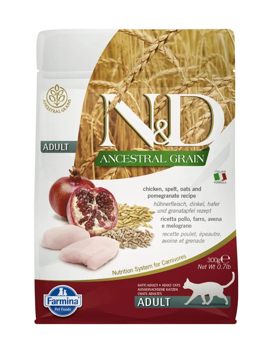 FARMINA ND ANCESTRAL GRAIN CHICKEN / POMEGRANATE ADULT is a complete low-grain dry food with chicken, spelt, oats and pomegranate for adult cats of all breeds.