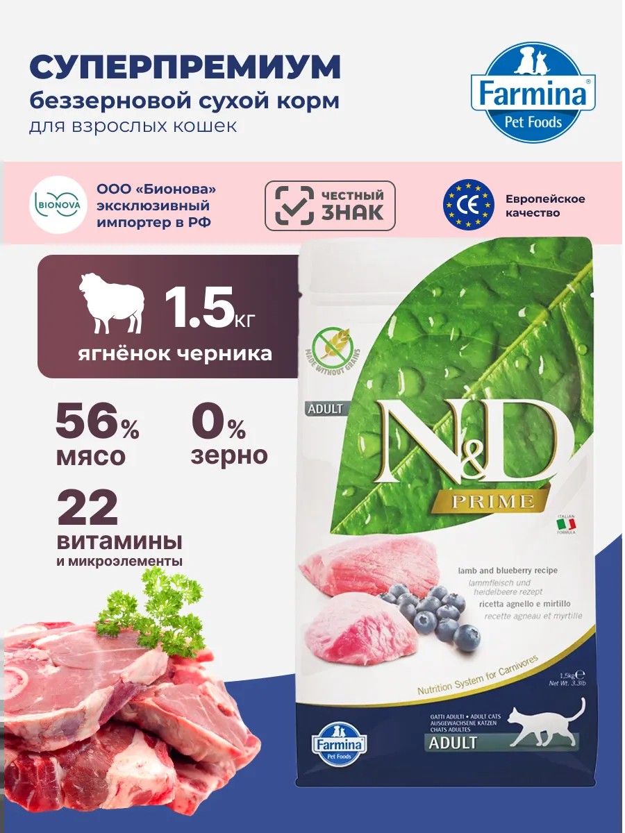 Сухой корм Farmina ND Prime беззерновой с филе Ягненка это сбалансированный рацион для взрослых кошек, поддерживающий активность и здоровье питомца каждый день. Гиперпремиум. Класс холистик .