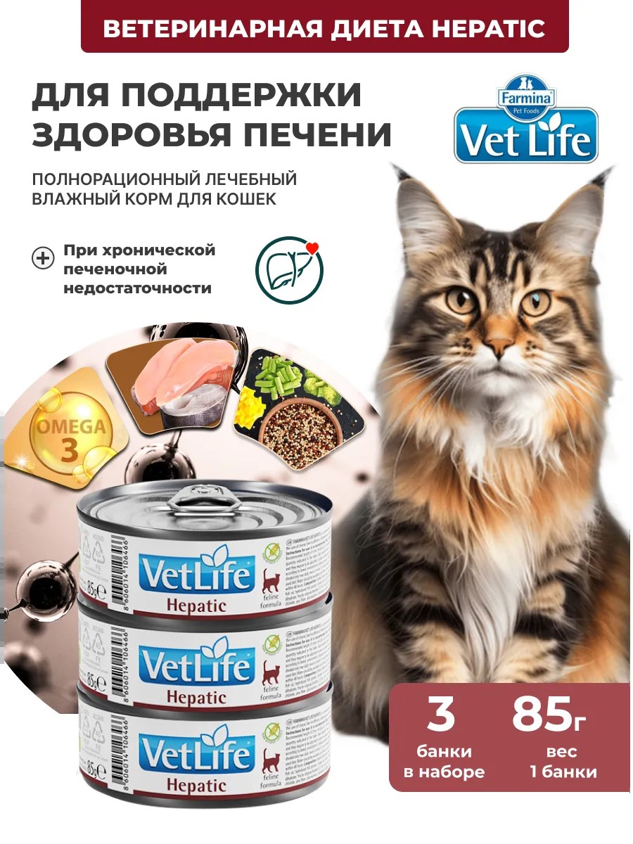 Farmina Vet Life Hepatic полнорационный диетический влажный корм для взрослых кошек для поддержки функции печени при хронической печеночной недостаточности. Умеренный уровень отборного и хорошо усваиваемого белка.