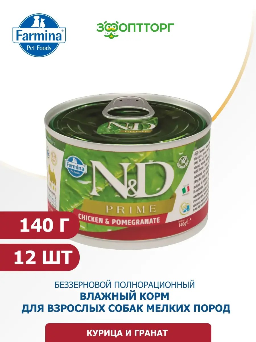 Full name of productFarmina N&D Dog Prime Adult Mini canned food for adult dogs of small breeds Chicken and pomegranate, 140 g package of 12 pcs.
