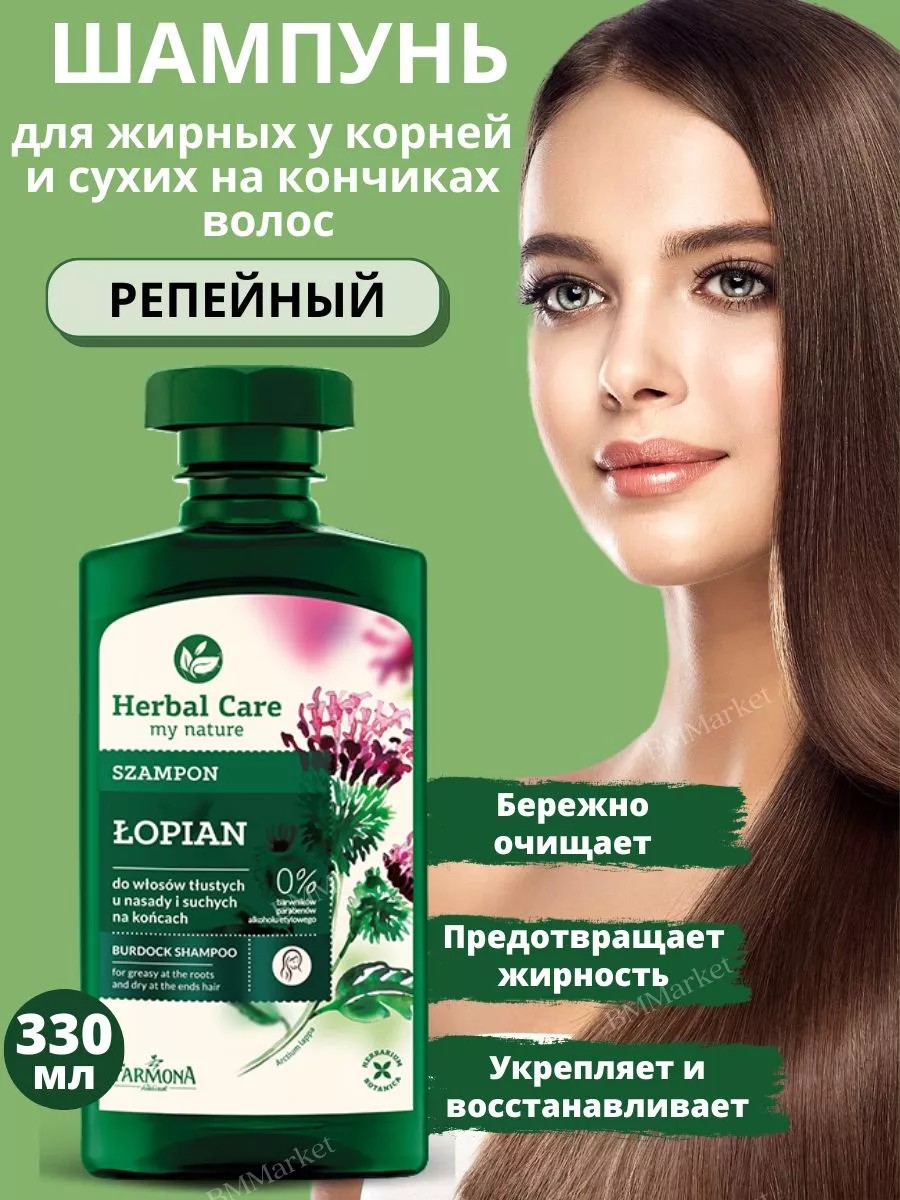 Шампунь для жирных волос у корней и сухих на кончиках Репейный Нerbal Care Burdock Shampoo содержит моющие вещества, которые не только качественно очищают волосы от загрязнений, остатков стайлинг-продуктов и излишков жира, но и обеспечивают качественный уход. Шампунь натуральный женский мужской предназначен для волос, жирных у корней и сухих на кончиках. Содержит щадящие для кожи головы и волос вещества, которые эффективно очищают и обеспечивают уход, стабилизируют работу сальных желез. Активные компоненты травяного шампуня Хербал Care: экстракт репейника борется с перхотью и предотвращает ее повторное возникновение, придает волосам живой блеск и объем, а также укрепляет структуру волоса. Биоактивный цинк PCA уменьшает жирность волос, а микромизированный пшеничный протеин придает волосам красивый и здоровый вид. Природный пребиотик инутек интенсивно питает и способствует более легкому расчесыванию волос, защищая их от повреждений. Шампунь для жирных корней обязательно должен быть в составе набора по уходу за волосами.