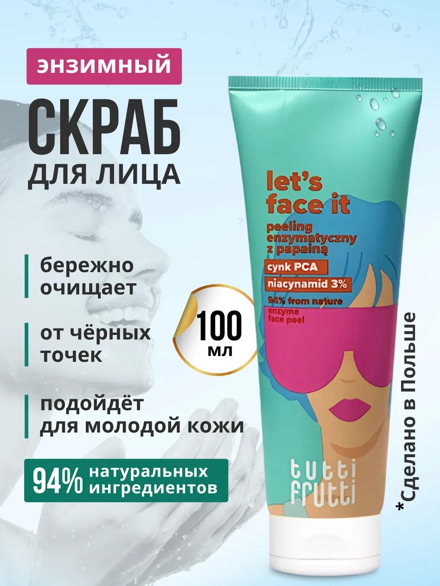 Энзимный скраб для лица от черных точек с экстрактом груши и имбиря от польского бренда Farmona Tutti Frutti Let's Face It. Эффективно бережно очищает кожу лица, мягко отшелушивая ороговевший эпидермис, обеспечивая противовоспалительный эффект. Активная формула с комплексом витаминов и минералов Detox Shot Mg заметно сужает и очищает поры, устраняя недостатки. Ниацинамид 3% в составе устраняет несовершенства и делает кожу ровной и сияющей, придавая осветляющий и выравнивающий тон эффект. Экстракты груши и имбиря тонизируют, улучшая микроциркуляцию, способствуя разглаживанию кожи и сужению пор. Папаин - мягкий, деликатный энзим, действующий подобно кислотам, очищает и выравнивает, параллельно повышая биодоступность средств, которые наносятся после этапа очищения. Скраб для лица натуральный, так как имеет в своем составе 94% ингредиентов натурального происхождения. Способствует устранению прыщей, угрей и черных точек на носу и подбородке. Уход за лицом в тубе подходит женщинам, мужчинам, так и подросткам с проблемной жирной, сухой, нормальной, чувствительной и комбинированной кожей. Органическое косметическое средство можно использовать в ванне, душе или в бане. При регулярном использовании делает кожу безупречно гладкой, придает ей естественное здоровое сияние, регулирует жирность кожи и предотвращает появление комедонов.