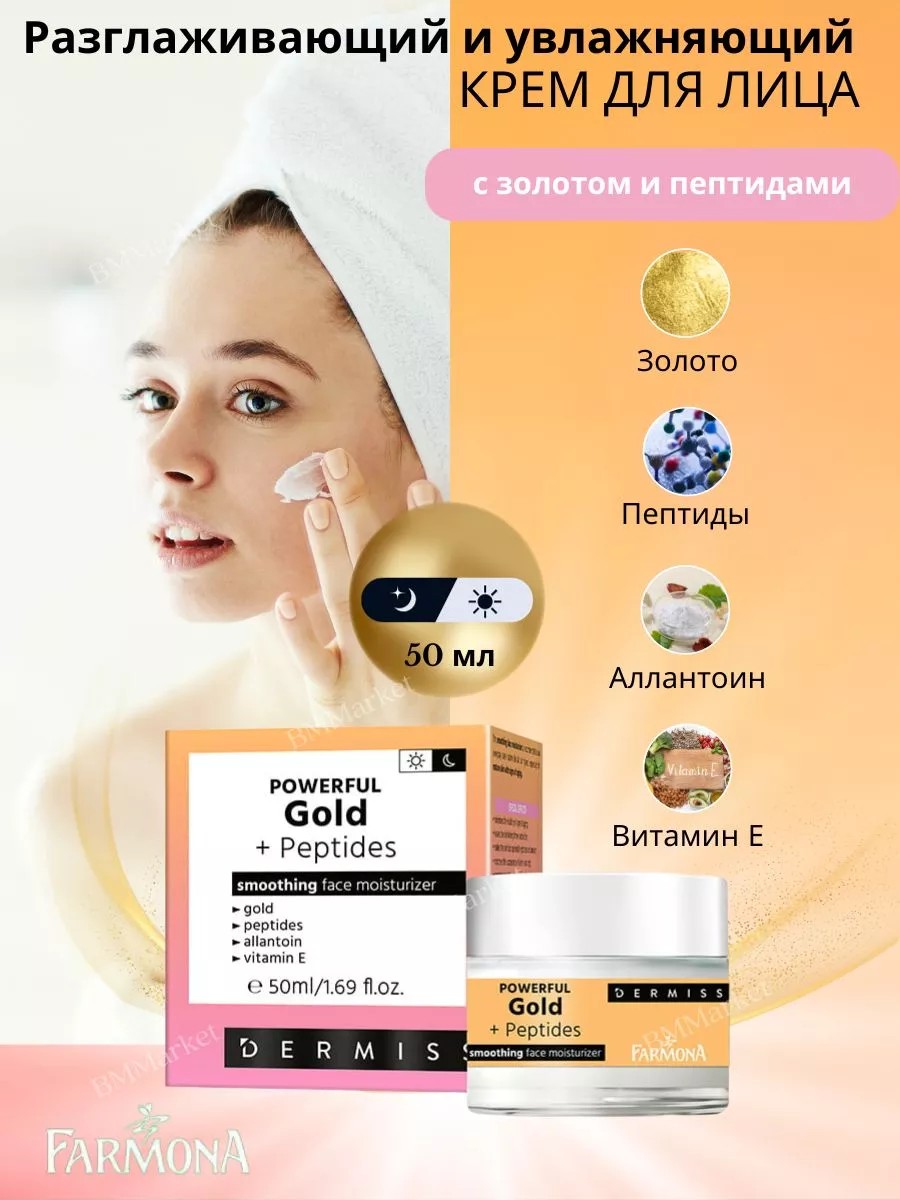 Омолаживающий крем для лица Farmona Dermiss с золотом и пептидами обладает разглаживающим и увлажняющим действием, повышает упругость и эластичность кожи, оказывает омолаживающий эффект, устраняет сухость и дряблость, придает сияние коже и гладкость. Крем для лица увлажняющий день ночь уменьшает выраженность мелких морщин и глубину крупных заломов, успокаивает, оказывает антиоксидантный эффект, предупреждая старение кожи. Активная формула крема делает кожу оптимально увлажненной и напитанной. Золото, витамин Е и пептиды замедляют появление видимых признаков старения кожи. Аллантоин помогает коже выглядеть более гладкой и увлажненной, уменьшает выраженность мелких морщин и глубину крупных заломов, успокаивает, оказывает антиоксидантный эффект, предупреждая старение кожи.