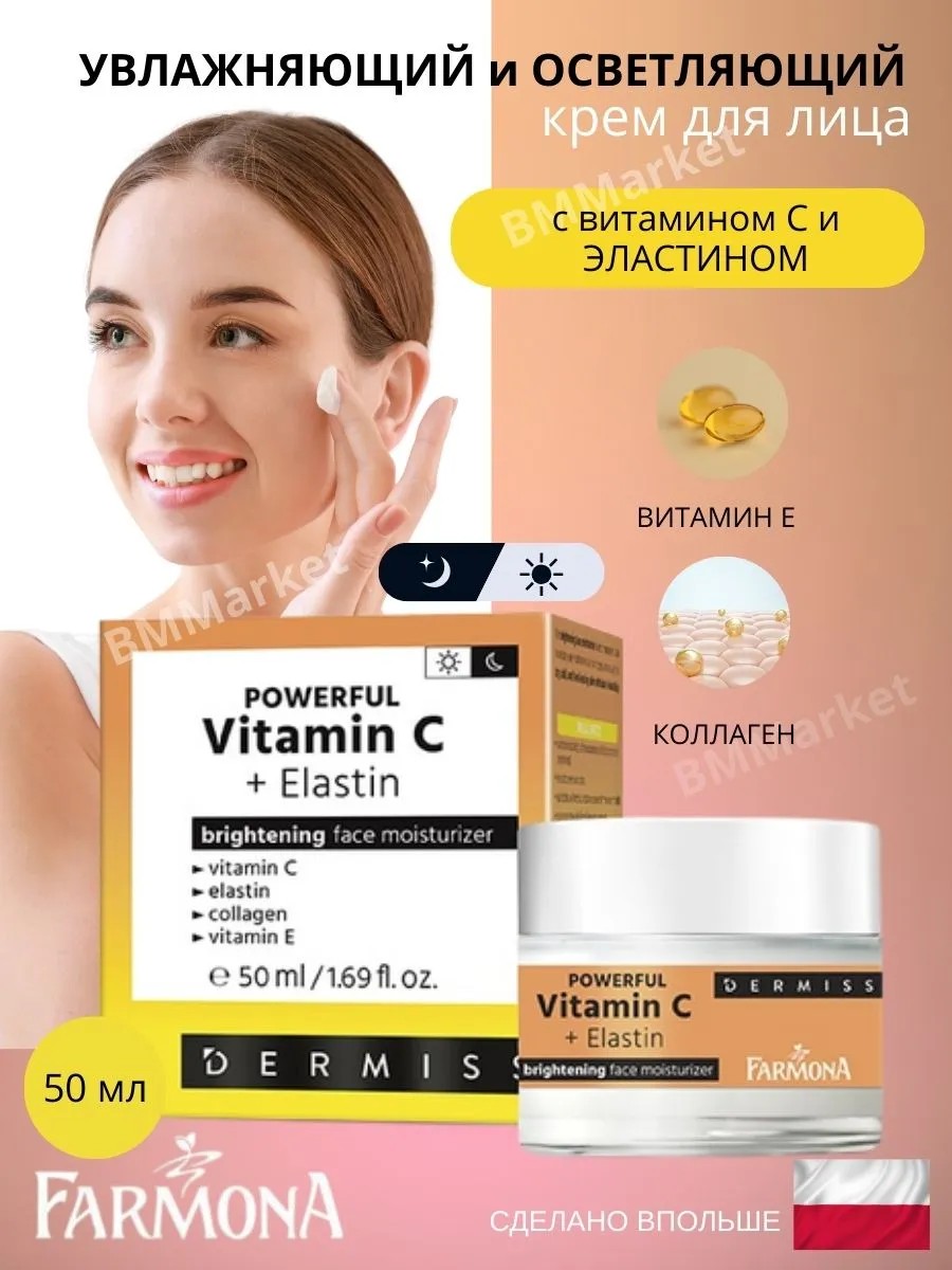 Увлажняющий осветляющий крем для лица с витамином С и эластином DERMISS от польского бренда Farmona – это идеальное решение для ежедневного ухода за всеми типами кожи, особенно для сухой, тусклой и уставшей. Этот крем не только выравнивает тон кожи, но и значительно улучшает ее общее состояние, придавая сияние и свежесть.