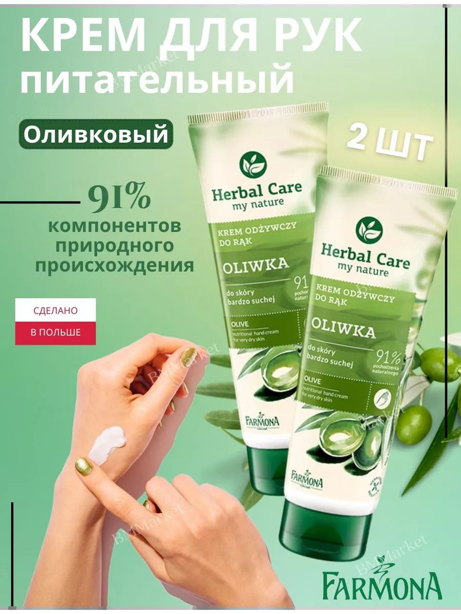 Питательный крем для сухой и поврежденной кожи рук и ногтей Оливка Нerbal Care от польского производителя Farmona содержит высококонцентрированные, нежные для кожи, натуральные активные компоненты, которые обеспечивают эффективный уход, восстанавливая красивый, молодой внешний вид ладоней. В составе крема 91% компонентов натурального происхождения. Активные компоненты: экстракт листьев оливы глубоко питает кожу, делая ее бархатистой и приятной на ощупь; масло ши смягчает и увлажняет кожу, защищая ее от вредных внешних факторов; травяной биокомплекс увлажняет кожу, повышая ее эластичность и защищая от сухости и обезвоживания; мочевина интенсивно увлажняет, смягчает и разглаживает кожу. Эффект от использования: вы получите бархатные ручки, которые будут отлично напитаны, гладкие, мягкие, защищенные от вредного воздействия внешних факторов, пересушивания и от трещен. Крем для рук мужской женский питательный подойдет для сухой кожи, для очень сухой кожи, а также для всех типов кожи. Натуральный крем для рук зимний, весенний, осенний и летний вариант защиты ваших рук и ногтей. Это бьюти средство обязательно должно быть в составе набора по уходу за телом.