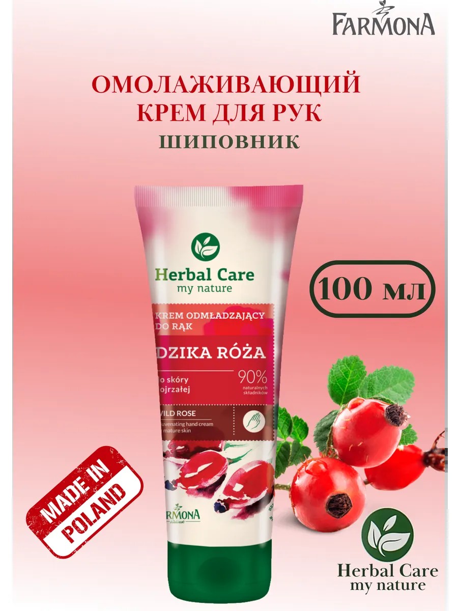 Омолаживающий крем для рук и ногтей шиповник от Farmona Herbal Care, 100 мл, производство Польша. Защитный крем для рук содержит высококонцентрированные, нежные для кожи, натуральные активные компоненты, которые обеспечивают эффективный уход, восстанавливая красивый, молодой внешний вид ладоней. Активные компоненты. Экстракт дикой розы великолепно увлажняет и питает кожу, а также улучшает её упругость, замедляя процессы увядания. Протеины шёлка великолепно разглаживают кожу, устраняя шероховатость эпидермиса, а также эффективно защищают от вредного воздействия внешних факторов. Витамин Е, называемый «витамином молодости», придаёт коже жизненную энергию, мгновенно её регенерирует и разглаживает, а также защищает от вредного воздействия ультрафиолетовых лучей. Делает кожу рук нежной и бархатистой. Крем для рук восстанавливающий содержит 90% ингредиентов натурального происхождения. Крем для рук фармона подходит для ежедневного применения.