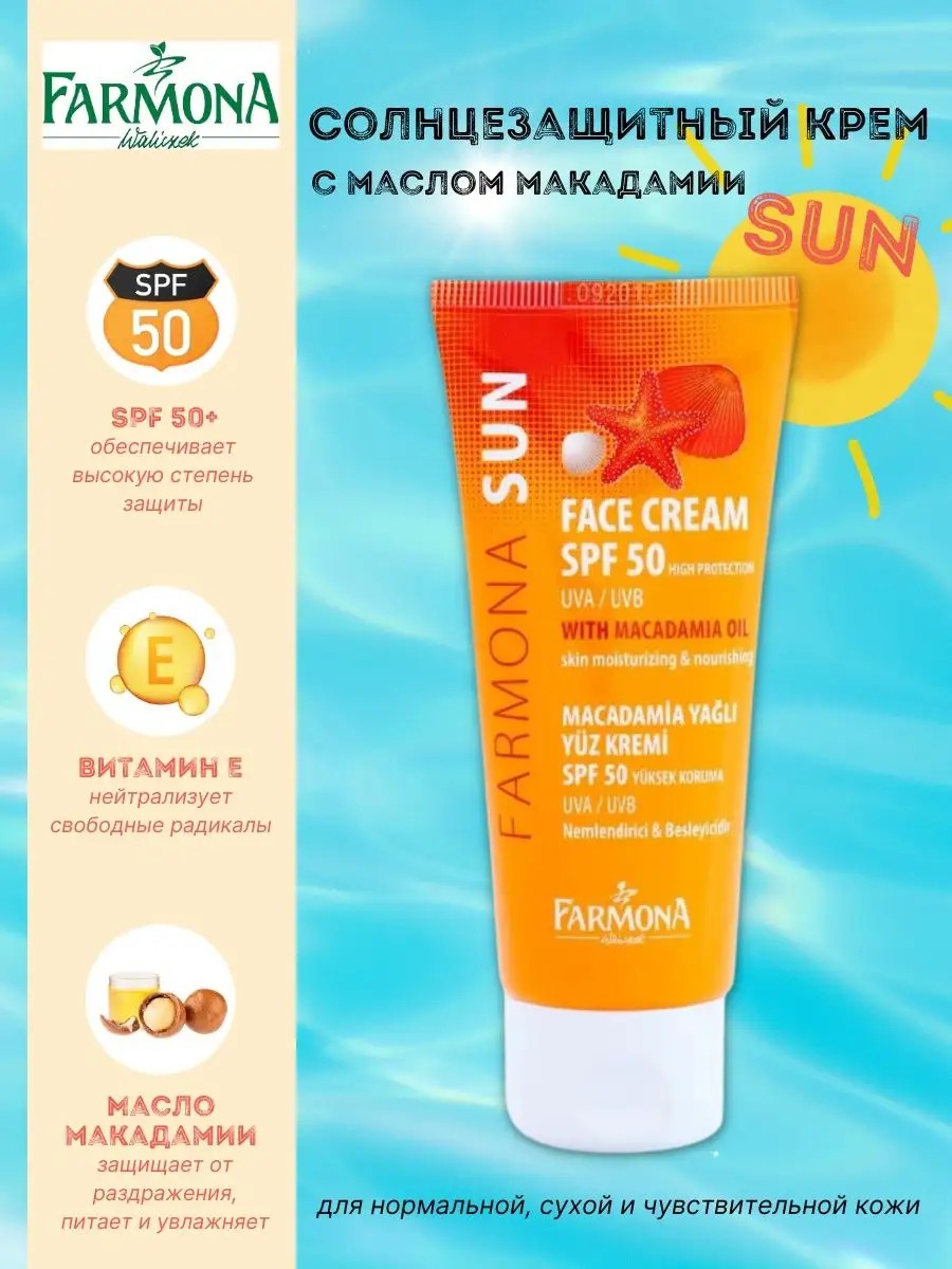 Protect your skin from the sun's harmful rays with Farmona's facial sunscreen. This sunscreen with macadamia oil and SPF 50 is ideal for normal, dry, and sensitive skin. Comprehensive sun protection with advanced UVA and UVB filters reduces the risk of skin cancer and premature aging.