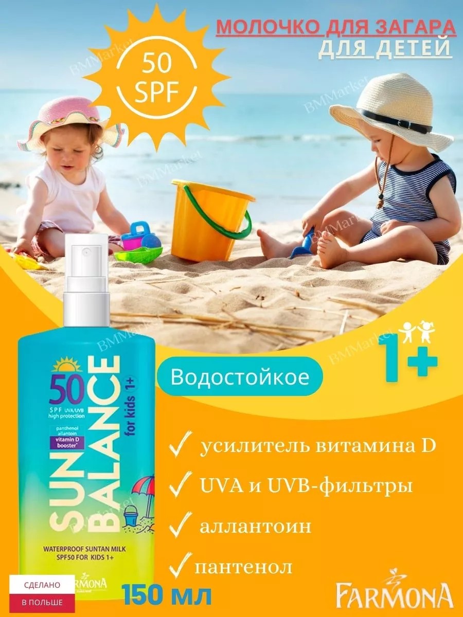 Водостойкое молочко для загара с защитой spf 50 Farmona SUN BALANCE предназначено для всей семьи, а также для детей от одного года. Солнцезащитное средство обеспечивает высокую защиту от UVA- и UVB-лучей, интенсивно увлажняет, питает и разглаживает кожу, делает ее менее раздраженной. Инновационный уход за самой требовательной кожей и комплексная защита от солнца для всех типов кожи, особенно для чувствительной кожи ребенка от 12 месяцев. Усовершенствованная система фотостабильных фильтров UVA и UVB обеспечивает всестороннюю защиту от солнца, снижает риск солнечных ожогов и преждевременного старения кожи при воздействии вредных ультрафиолетовых лучей. Активатор витамина D обеспечивает равновесие между естественным процессом активации витамина D в коже и необходимой защитой от солнца. Пантенол восстанавливает и защищает кожу от чрезмерного высыхания. Аллантоин интенсивно увлажняет, разглаживает и смягчает эпидермис. Молочко для загара для тела обладает такими свойствами, как водостойкость и устойчивость к прилипанию песка. Водостойкость - оставляет на коже невидимую пленку, защищающую от ультрафиолетового излучения во время купания. Устойчивость к прилипанию песка - отсутствие масляного слоя на коже обеспечивает комфорт и предотвращает чрезмерное прилипание песка. Молочко для загара солнцезащитное дерматологически протестировано. Способ применения: равномерно нанести молочко для загара детское на кожу за 20-30 минут до выхода на солнце. Для обеспечения защиты продукт следует наносить повторно, особенно после потоотделения, плавания или вытирания.