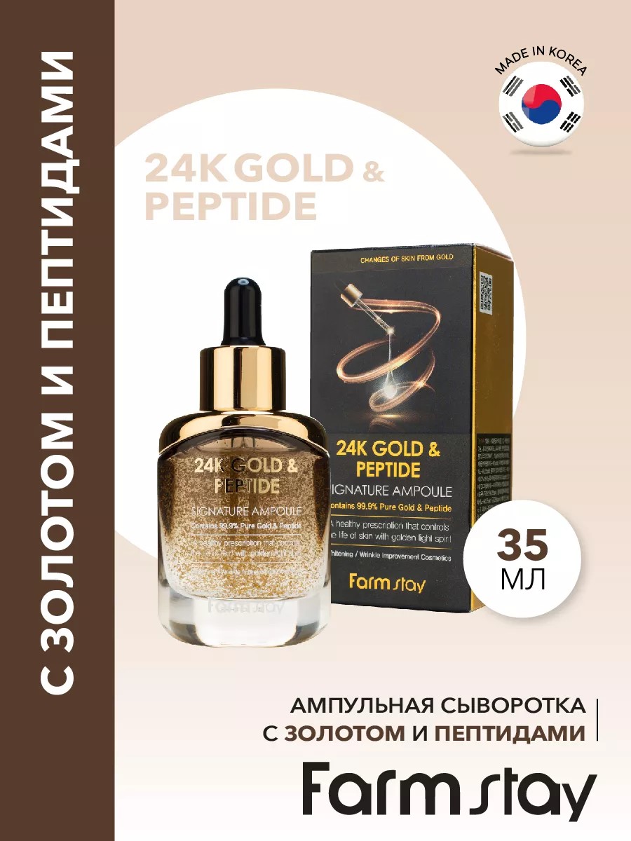 Антивозрастная ампульная сыворотка для ухода за кожей лица и шеи Корея с золотом и пептидами запускает процессы омоложения, улучшает тургор и состояние эпидермиса. Сыворотка для лица омолаживающая обогащена экстрактом чистого 99,9% золота, пептидами. Пептидный комплекс улучшает структуру кожи, повышает тонус, эластичность и плотность возрастной кожи, сокращает морщины. 24к коллоидное золото восстанавливает эластичность тканей, уменьшает УФ повреждение кожи, борется с возрастными пятнами, выводит токсины, укрепляет защитные свойства эпидермиса, восстанавливает эластичность. Подходит для зрелой кожи, в том числе и для проблемной. Идеальный подарок женщине, маме, подруге, девушке на день рождения, Новый год, 8 марта, день Святого Валентина. Применение: утром и вечером наносить небольшое количество сыворотки на лицо и шею после очищения и тонера. Затем нанести эмульсию, крем или ночную маску. Рекомендуется к использованию в комплексе с серией корейской косметики для ухода за лицом и телом FarmStay / Фарм Стей.