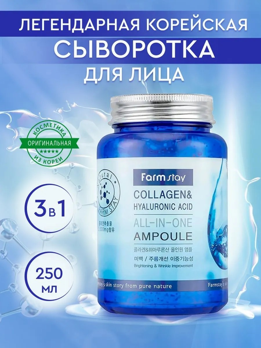 Представляем Вам увлажняющую сыворотку для лица с морским коллагеном, гиалуроновой кислотой и витаминами. Это оригинальная уходовая косметика корейского производства, обладающая эффективным восстанавливающим и омолаживающим, осветляющим и укрепляющим действием. Питательная витаминная формула «Farm Stay» содержит экстракт камелии и гамамелиса, аденозин и ниацинамид. Она отлично увлажняет, помогая в борьбе против сухости и шелушений. Сыворотка выравнивает тон кожи, способствует уменьшению пигментации и укреплению защитного барьера дермы. Это косметическое средство для профессионального ухода за лицом, шеей и зоной декольте, подходящее, чтобы работать с мезороллером. Сыворотка с подтягивающим лифтинг - эффектом разглаживает морщинки, обеспечивая восстановление гидробаланса и выравнивание микрорельефа эпидермиса. Она полезна при отбеливании и осветлении пигментных пятен и веснушек. Азиатский косметический продукт станет лучшим выбором для взрослых женщин и молодых девушек. Он поможет сохранить молодость, красоту и здоровое сияние кожи. Сыворотку с легкой текстурой рекомендуется ежедневно утром или вечером наносить на лицо, после предварительного очищения кожи. Она подойдет для всех типов женской кожи, включая нормальную и жирную, комбинированную и чувствительную. Коллагеновая формула с популярными в косметологии ингредиентами поставляется в большой баночке объемом 250 мл, упакованной в коробочку. Она обеспечит глубокое увлажнение дряблой возрастной кожи, поможет сделать ее свежей и красивой. Это идеальный выбор для повседневного ночного и дневного ухода. У бренда вы также найдете омолаживающую сыворотку с коллагеном (collagen) для ухода за кожей век. Прекрасное подарок любимой девушке на день влюбленных. У нас есть акции и распродажи, вы можете купить наши товары в подарок со скидкой!