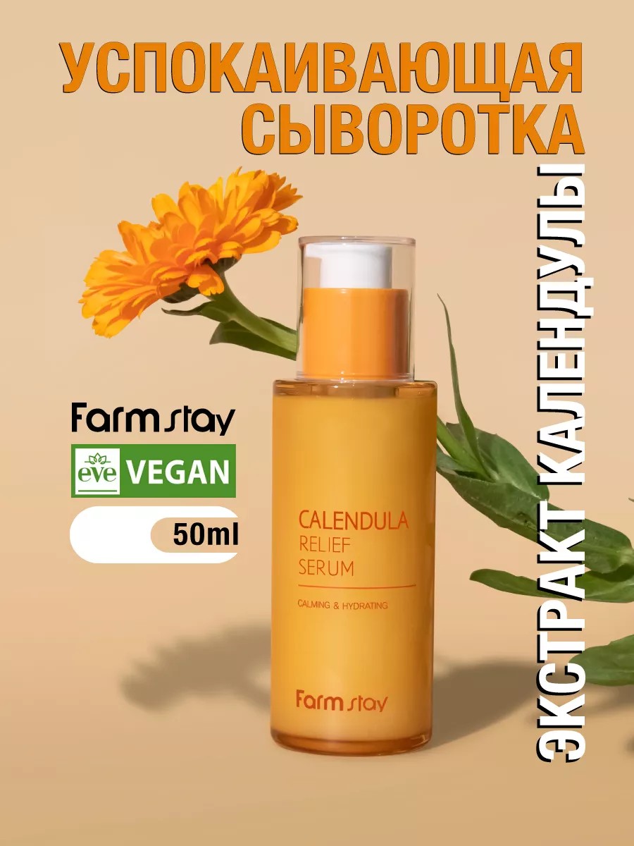 A soothing, moisturizing serum with calendula extract for intensive care of the face, neck, and décolleté, made in Korea. This soothing serum improves the skin's protective barrier, filling it with strength and energy, and promotes active restoration, leaving a pleasant feeling of freshness and hydration. The formula is developed using natural ingredients, providing a complete complex of hydration and nutrients. The combination of niacinamide and hyaluronic acid creates an invisible barrier that prevents moisture loss and activates epidermal renewal processes. Calendula extract, enriched with antioxidants, soothes irritations and damaged areas of the epidermis and improves its overall condition, smoothing wrinkles and minimizing signs of aging. A unique complex of plant extracts, such as coptis root, asparagus extract, mint leaves, thyme, and green tea, impart a feeling of freshness, hydration, and cleanliness, beneficially affecting the overall condition of the epidermis. Hydrolyzed collagen maintains the elasticity of the face, neck, and décolleté. Adenosine combats the signs of aging. This ampoule serum is the embodiment of comprehensive care, enhancing natural radiance and nourishing the epidermis, promoting rejuvenation. It is free of animal products and allergens, providing only the best refreshing care. A wonderful addition to your personal care routine. Suitable for all skin types, including problematic skin in need of a moisturizing and soothing effect. Directions: Apply a few drops to cleansed and toned skin of the face, neck, and décolleté, massaging gently until completely absorbed. Then apply an emulsion or cream. This Korean ampoule serum makes an ideal gift for a woman—mother, friend, or girlfriend—for a birthday, New Year, March 8th, or Valentine's Day. Recommended for use in combination with the FarmStay series of Korean cosmetics for face and body.