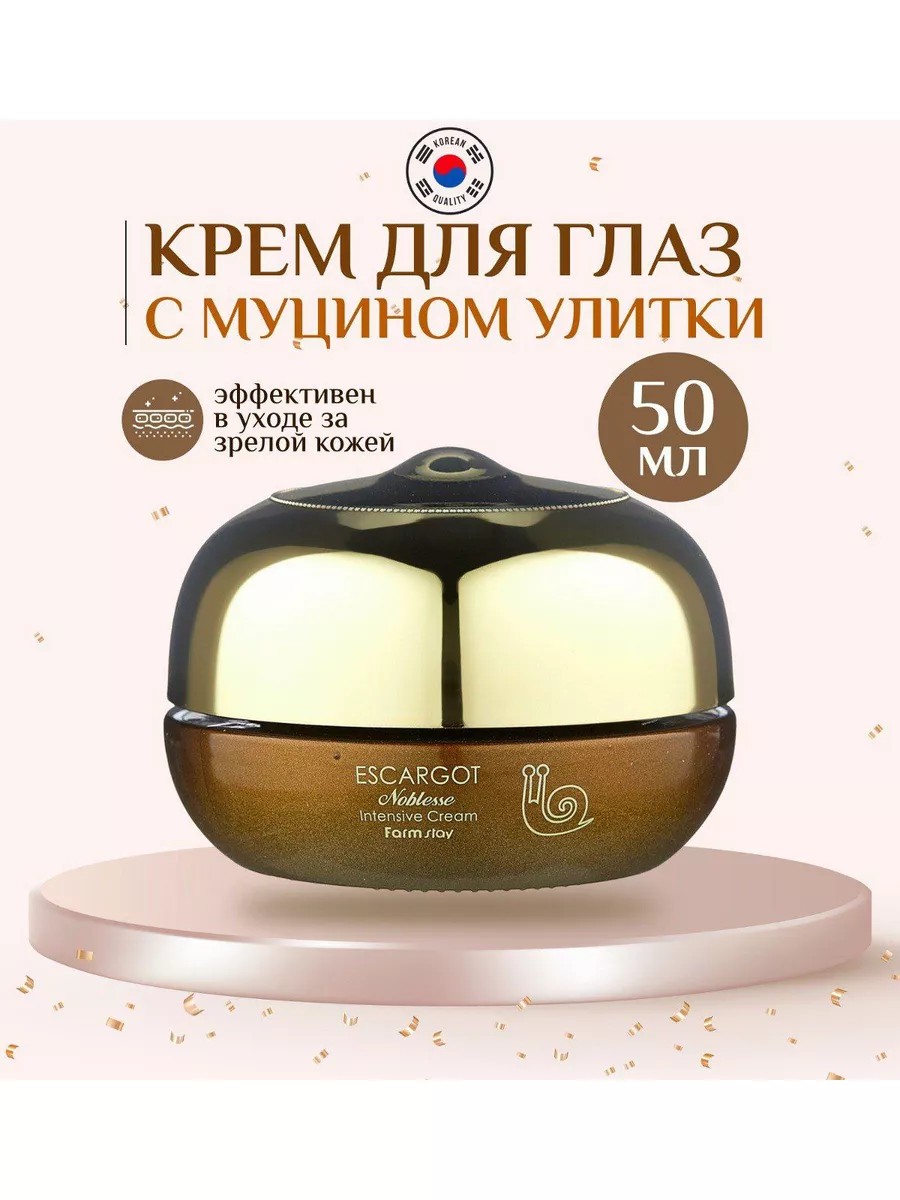 Регенерирующий крем для кожи вокруг глаз с муцином улитки Farmstay Escargot Noblesse Intensive Eye Cream эффективен в уходе за зрелой кожей. Крем отлично питает, устраняет сухость, способствует осветлению пигментации и тёмных кругов в области вокруг глаз. Способ применения: нанесите необходимое количество крема на область вокруг глаз. Легкая текстура крема мгновенно впитывается, успокаивает раздражения, восстанавливает структуру эпидермиса и смягчает его. Базовый косметический продукт премиального качества подходит взрослым мужчинам и женщинам,с любым типом дермы, включая жирную, чувствительную и проблемную. Сбалансированный состав несмываемой продукции, разработанной по уникальной формуле, включает безвредные для здоровья и эффективные ингредиенты. Главные компоненты - муцин улитки, ниацинамид, аденозин и растительный экстракт. Крем содержит множество других полезных веществ. Муцин улитки обладает ранозаживляющим, противовоспалительным действием, помогает против трещин, способствует заживлению повреждений и выравниванию тона и текстуры дермы. Ниацинамид также помогает против шелушения, покраснений и других раздражений, а также способствует повышению (усилению) защитных свойств эпидермиса, сужению расширенных пор. Также ингредиент оказывает расслабляющее действие, снимает следы усталости и делает эпидермис сияющим. Аденозин стимулирует синтез природного эластана и коллагена, имеет антивозрастной, разглаживающий и подтягивающий эффектСредств следует распределять по коже мизинчиками, мягко вбивая его в кожу.Состав: вода, глицерин, минеральное масло, каприлик каприловый триглицерид, ПЭГ-100 стеарат, стеариновая кислота, масло ши, сорбитан сесквиолеат, экстракт листьев барбадосского алоэ, экстракт лаванды, экстракт магнолии, фильтрат секреции улитки.