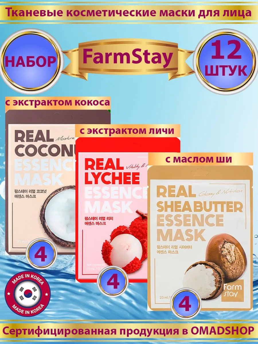 Набор корейских тканевых масок FarmStay - 12 штук. В состав набора входят: