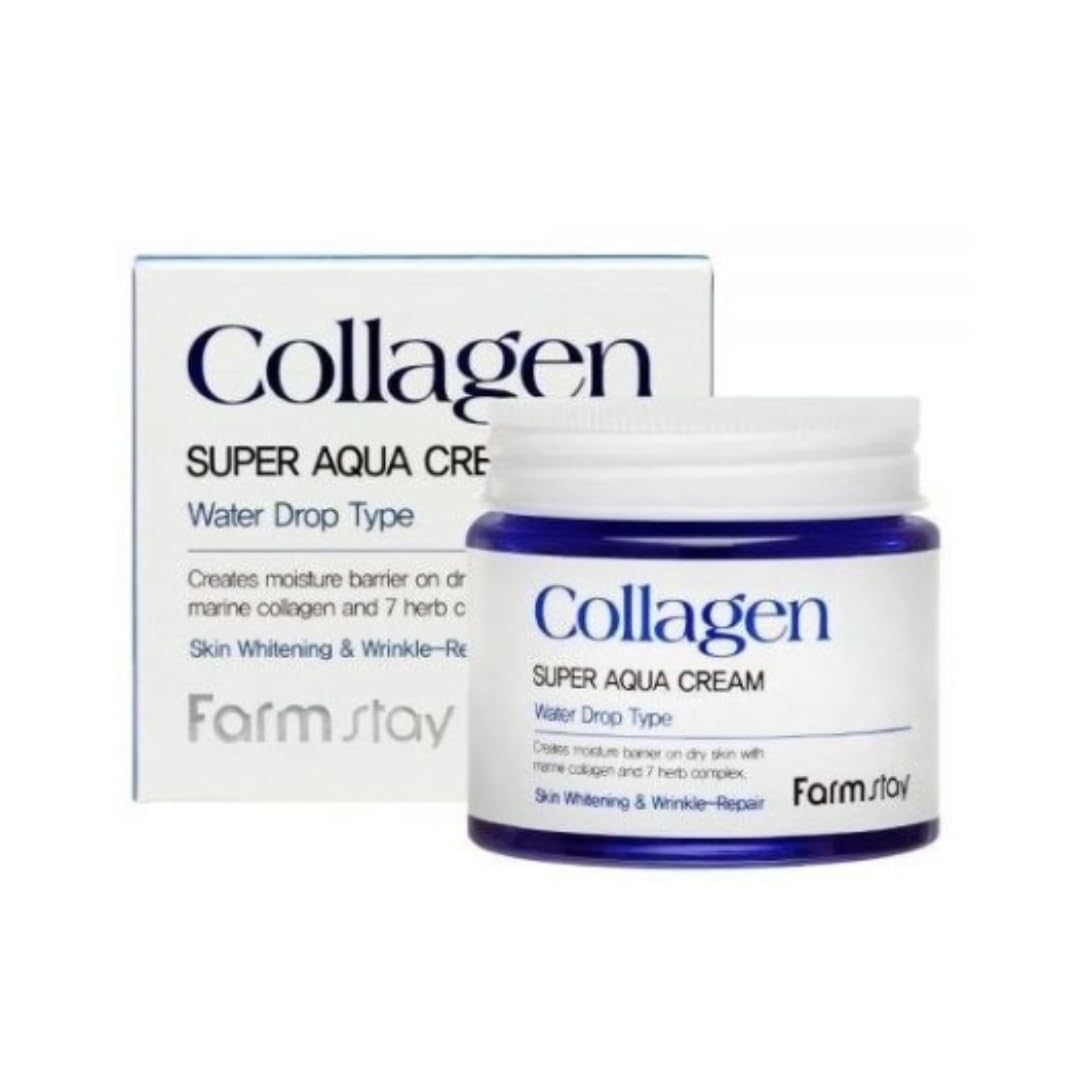 Moisturizing collagen Farmstay Collagen Super Aqua Cream Water Drop helps the skin stay healthy, youthful and beautiful for longer. By storing moisture, the cream protects the skin against dryness, loss of elasticity and wrinkles. In addition, the cream excellently counteracts the existing signs of skin aging. Application: Apply to cleansed and toned skin. INGREDIENTS water, cyclopentasiloxane, glycerin, dipropylene glycol, niacinamide, sodium chloride, betaine, trehalose, cetyl PEG PPG-10 1 dimethicone, phenoxyethanol, cyclohexasiloxane, dimethicone vinyl dimethicone crosspolymer, ethylhexylglycerin, adenosine, fragrance, dimethicone. odium EDTA, Butylene Glycol, Hydrolyzed Collagen, Linalool, Hexyl Cinnamal, Chamomilla Recutita (Matricaria) Flower Extract, Lavandula Angustifolia (Lavender) Flower Extract, Melissa Officinalis Leaf Extract, Origanum Majorana Leaf Extract, Rozemarinus Officinalis (Rosemary) Leaf Extract, Salvia Officinalis (Sage) Leaf Extract, Thymus Vulgaris (thyme) Leaf Extract, Geraniol, 1,2-hexanediol.Relieves irritation. Removes wrinkles and refreshes them. Makes them firm and elastic. It makes them smooth and tighter.FARMSTAY Farmstay Collageen Super Aqua Cream Water Drop Hydraterend collageen Farmstay Collageen Super Aqua Cream Water Drop helpt de huid langer gezond, jeugdig en mooi te blijven. Door vocht op te slaan, beschermt de crème de huid tegen droogheid, spankrachtverlies en rimpels. Bovendien gaat de crème de reeds aanwezige tekenen van huidveroudering uitstekend tegen. Toepassing: Aanbrengen op de gereinigde en getoniseerde huid. INGREDIËNTEN water, cyclopentasiloxaan, glycerine, dipropyleenglycol, niacinamide, natriumchloride, betaïne, trehalose, cetyl PEG PPG-10 1 dimethicone, fenoxyethanol, cyclohexasiloxaan, dimethicone vinyl dimethicone crosspolymeer, ethylhexylglycerine, adenosine, fragrance, dimethicone. odium EDTA, Butylene Glycol, Hydrolyzed Collageen, Linalool, Hexyl Cinnamal, Chamomilla Recutita (Matricaria) Flower Extract, Lavandula Angustifolia (lavendel) Flower Extract, Melissa Officinalis Leaf Extract, Origanum Majorana Leaf Extract, Rozemarinus Officinalis (Rosemary) Leaf Extract, Salvia Officinalis is (Sage) Leaf Extract, Thymus Vulgaris (tijm) Blad Extract, Geraniol, 1,2-hexaandiol.Verlicht irritatie. Verwijdert rimpels en verfrist ze. Maakt ze stevig en elastisch. Het maakt ze glad en strakker.