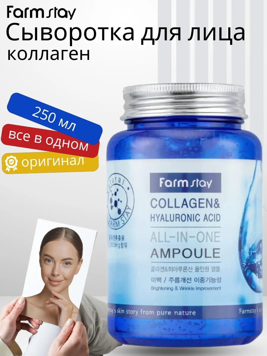 Ампульная сыворотка FarmStay Collagen Hyaluronic Acid All-In-One Ampoule с гиалуроновой кислотой и коллагеном оказывает осветляющий и антивозрастной эффект. Морской коллаген и гиалуроновая кислота поддерживают здоровое сияние и гладкость кожи. Понижение выработки коллагена в коже плохо отражается на ее состоянии.