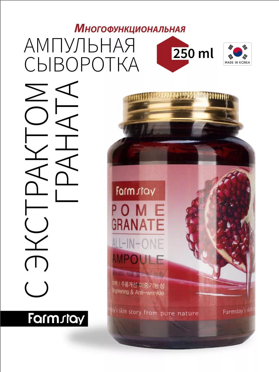 Ампульная сыворотка для ухода за кожей лица, шеи и декольте Корея с экстрактом граната увлажняет и питает кожу витаминами. Кожа гладкая и сияющая. Гранат богат антиоксидантами, защищает от негативного воздействия окружающей среды, стимулирует естественное обновление кожи. Экстракт кожуры граната оказывает вяжущее, бактерицидное, противовоспалительное действие, снимает раздражение и восстанавливает естественный баланс кожи. Экстракт гриба санхван приводит в норму уровень глюкозы в крови, также липидный обмен, стимулирует дыхание клеток. Экстракт ледяного гриба обладает детокс эффектом, удерживает влагу, улучшает клеточный метаболизм. Экстракт магнолии уменьшает воспаления, ожоги, вызванные уф-излучением. Для всех типов кожи. Применение: утром и вечером наносить небольшое количество сыворотки на кожу лица и шеи после очищения и тонера. Затем нанести эмульсию, крем или ночную маску. Идеальный подарок женщине, маме, подруге, девушке на день рождения, Новый год, 8 марта, день Святого Валентина. Применение: нанесите на кожу легкими разглаживающими движениями после использования очищения. Рекомендуется к использованию в комплексе с серией корейской косметики для ухода за лицом и телом FarmStay / Фарм Стей.