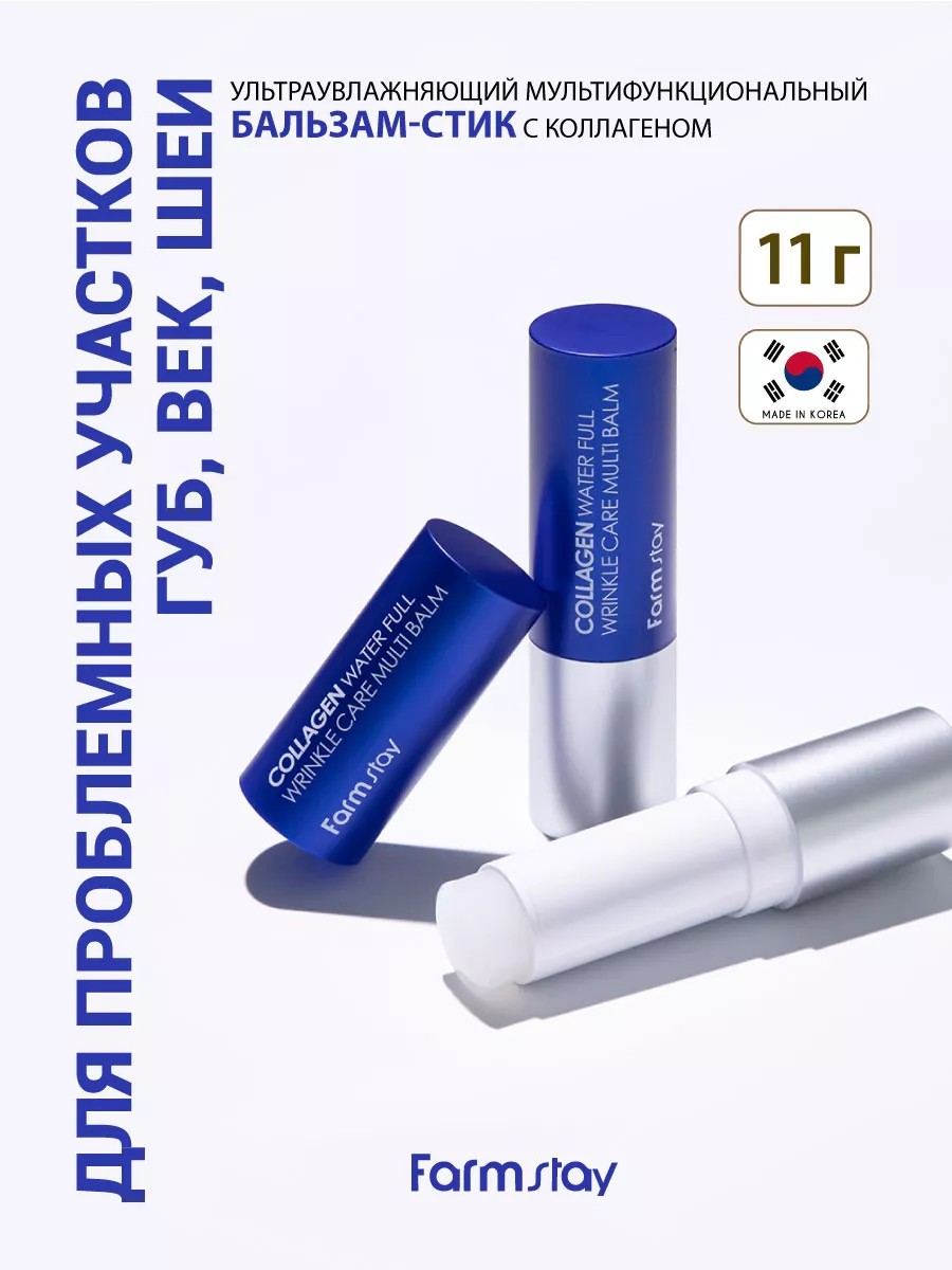 Moisturizing and nourishing balm for the face, neck, and lips. FarmStay Collagen Water Full Wrinkle Care Multi Balm, 11g. This ultra-moisturizing multifunctional Korean balm stick for the eyelids, forehead, nasolabial folds, and neck provides deep and instant regeneration, perfectly hydrating and nourishing the skin. This universal nourishing balm effectively softens the epidermis, strengthens its lipid protective barrier, smoothes, and prevents dryness. Hydrolyzed marine collagen in this hygienic balm tightens and firms the skin, helps maintain its firmness and elasticity, and helps retain moisture. This multifunctional balm is designed for all skin types, including problematic skin. Directions: Apply the balm stick to problem areas (eyelids, lips, and neck). Lightly massage until completely absorbed, do not rinse. Use daily or as needed for a moisturizing and nourishing effect. Farm Stay's Korean balm stick makes an ideal gift for a woman—your mother, friend, or girlfriend—for a birthday, New Year, or March 8th. Recommended for use in combination with the FarmStay line of Korean facial and body care products.