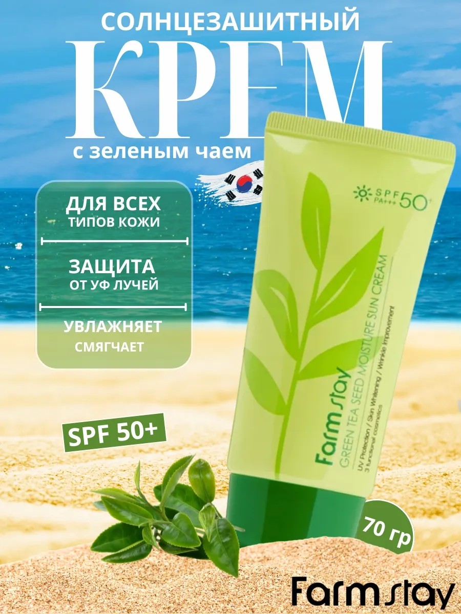 Солнцезащитный крем SPF 50+ FarmStay Green Tea Seed Moisture Sun Cream SPF50+ PA+++.Его формула эффективно блокирует UVB и UVA-излучение, предотвращая повреждение кожи как на солнце, так и в солярии. Спф для лица эффективно защищает кожу от вредного солнечного излучения, пигментации, фотостарения, солнечных ожогов.Солнцезащитный крем для лица с экстрактом зеленого чая сохраняет кожу мягкой и увлажненной, обладает антибактериальными свойствами. SPF 50 не только защищает от УФ-лучей, но и предотвращает появление пигментных пятен, и предотвращает фотостарение кожи.