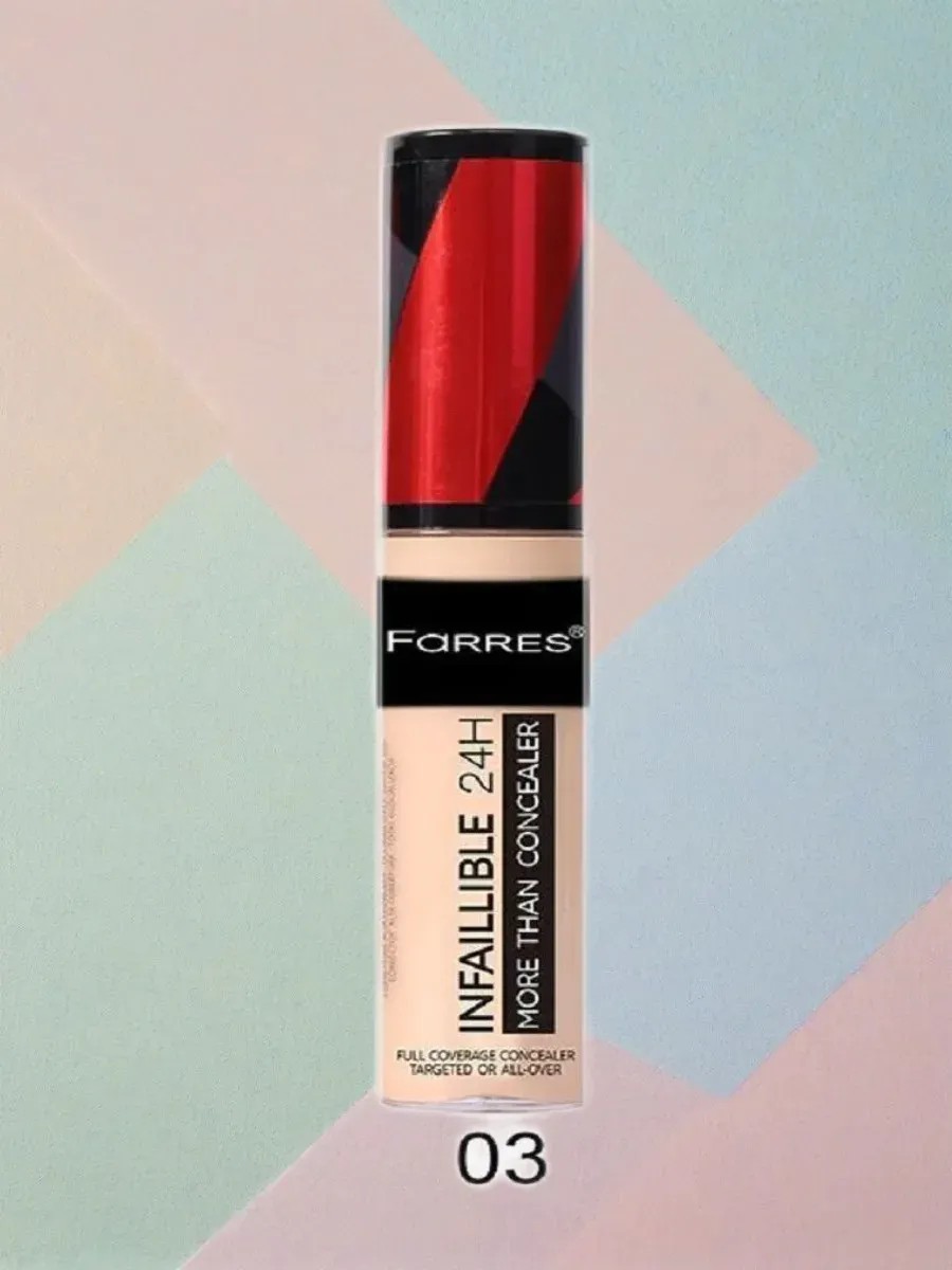 Farres Infaillible Concealer with Dense Coverage 4055. Farres Infaillible Concealer is a long-lasting, multi-functional product with a large, convenient applicator. It is suitable for both spot correction of skin imperfections and for fully evening out skin tone around the eyes. The highly pigmented and soft formula moisturizes and mattifies the skin without creating a mask effect. The product does not transfer, roll, clog pores, or cause skin problems. The result is perfect makeup and 24-hour super-long-lasting coverage. Evenly distribute the concealer over problem areas of the face using the applicator or sponge. Blend the concealer with light patting movements, moving from the periphery to the center of the face. Repeat the procedure if necessary for more dense coverage.