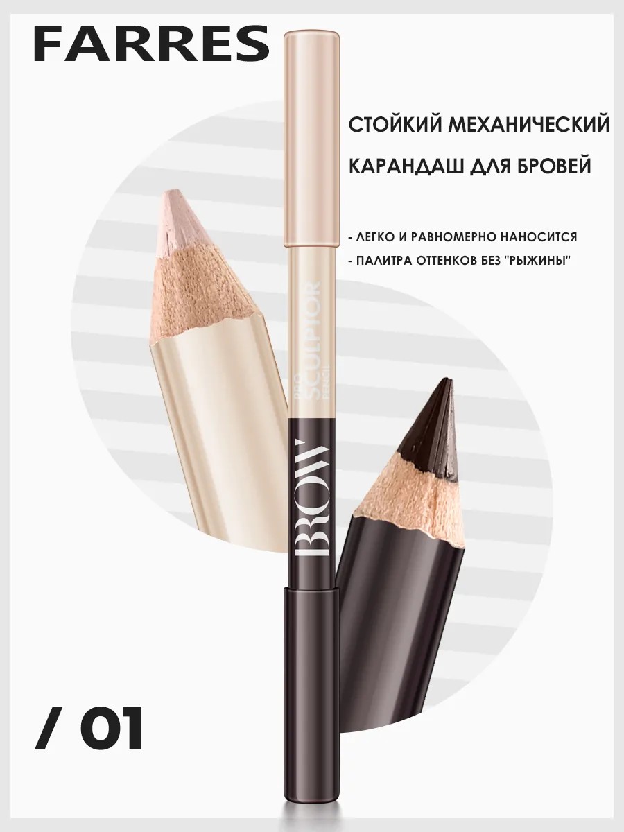 contour pencil is a versatile product that's perfect for lip, eye, or eyebrow makeup. This Farres product will help you create beautiful looks for every day or special occasions. Its optimal shape makes it comfortable to hold. This double-ended beauty product is a colored pencil on one side and a highlighter on the other. Its non-mechanical rods ensure quick and easy correction, helping to shape eyebrows according to hair growth and prevent smudging. The pencil is easy to blend, allowing for a variety of application options. The brand's collection offers several colors: light brown, dark brown (chocolate), chestnut, and black. This is a great option for creating freckles. The long-lasting "Brow" pencil will easily become part of a cosmetics gift set, perfect for giving to your beloved mother, friend, or sister for a birthday, Women's Day, anniversary, or just because. This product is hypoallergenic. The right texture will help you quickly achieve the desired effect. This multifunctional tool for creating precise lines, shaping eyeliner, and even contouring will find its place among decorative cosmetics and facial care products. It is ideal for contouring, shaping, and shaping eyebrows, eyes, and lips. The soft wax rod has a long-lasting formula and does not smudge. The thin tip helps create graphic eyeliner, and the powder highlighter adds vibrant accents to your finished look. This cosmetic product, based on natural ingredients, is ideal for dry, oily, sensitive, combination, and problematic skin. It also offers matte and pearlescent shades. It is a wonderful option for creating nude, natural, or vibrant makeup looks for every day or for special occasions. We have promotions and sales, so you can buy our products as gifts at a discount!
