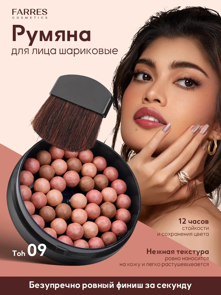 Шариковые румяна подарят коже сияние и эффект скульптурирования. Представленный beauty - продукт FARRES обладает натуральной минеральной формулой, которая способствует идеальному покрытию при создании макияжа.