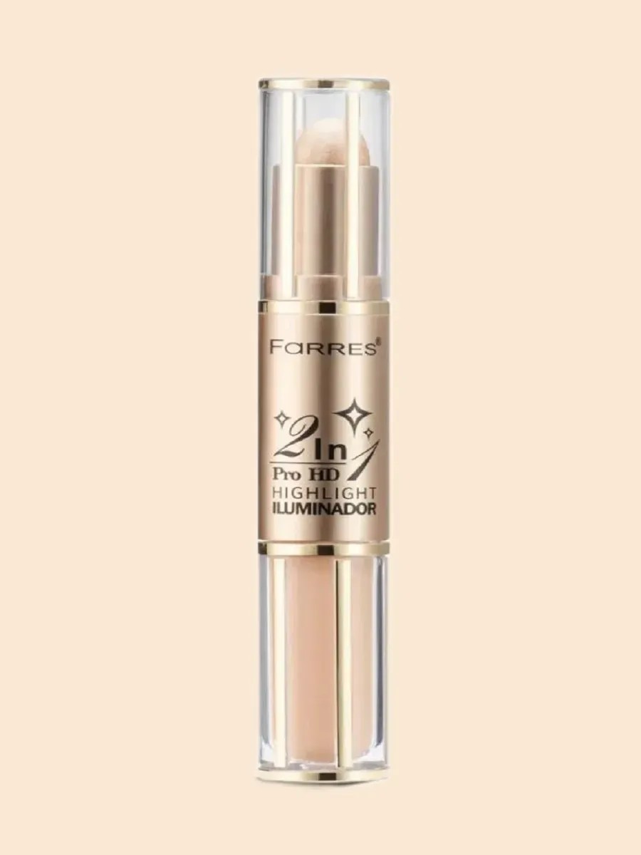 Farres Iluminador 2-in-1 Face Highlighter 4040. This 2-in-1 highlighter is a stick and liquid highlighter in one product! Using the highlighter, you give your skin a magical glow, leaving it looking rested and hydrated. The highlighter stick can be applied directly to areas you want to highlight. The liquid highlighter adds a more noticeable glow to the face and is perfect for evening makeup! After completing your makeup, apply the highlighter to the bridge of your nose, cheekbones, and lip crease. Blend if necessary.