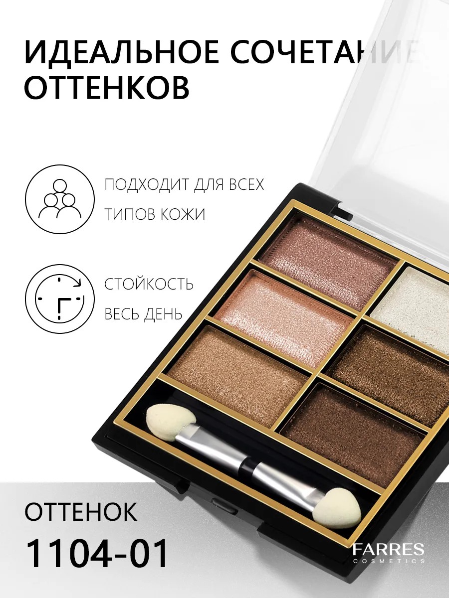 Откройте для себя искусство макияжа вместе с универсальной палеткой теней FARRES! В ней собрано 6 гармоничных оттенков — от нежных нюдовых до насыщенных глубоких тонов с перламутровыми и мерцающими акцентами.