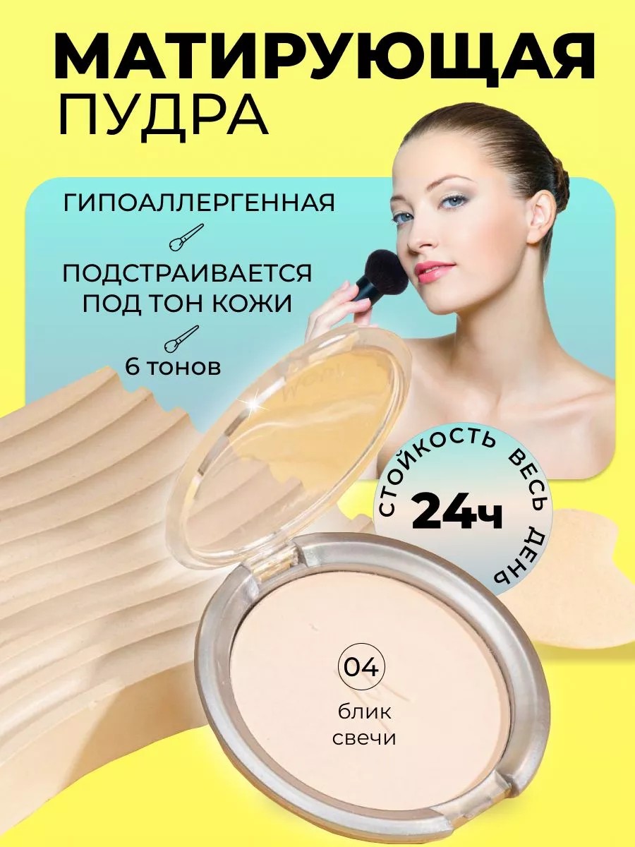 Матирующая компактная пудра от Moda - это новинка, которая должна быть в косметичке каждой девушки! Она прекрасно матирует и освежает, делает кожу гладкой и бархатистой. Косметика отлично выравнивает тон лица и дарит матовый эффект. Особенности продукта: устраняет жирный блеск, имеет легкую невесомую текстуру, ложится равномерно, подходит как spf (спф) под макияж. Идеально подстраивается под тон кожи, устраняет ее недостатки, скроет пигментные пятна. Рассыпчатая пудра ложится прозрачной тончайшей вуалью, если наносить кистью. Она с легкостью визуально убирает несовершенства кожи, сужает поры, матирует, не стягивает и не сушит кожу. Без талька, без крахмала создает стойкий и естественный макияж без эффекта маски. Бесцветная и прозрачная не забивает поры, как обычная компактная пудра, прекрасно послужит, как основа под макияж. Может использоваться и как праймер ( затирка для пор ) до нанесения тона и, как завершающий этап макияжа, отлично фиксирует make up (мэйкап). После применения кожа выглядит естественной, гладкой и молодой и ровной. Используются минеральные ингредиенты, чтобы сохранить кожу свежей и естественной. Бархатная финишная пудра фиксатор подойдет для любого типа кожи: жирной, сухой, чувствительной, комбинированной и даже для проблемной. Мягкий спонж в комплекте. Матирующий финиш для лица подарит эффект фотошопа. Способ применения: после процедур по уходу за кожей, деликатно распределите спонжем на коже лица. Можно наносить на заключительном этапе макияжа или по мере проявления жирности кожи.