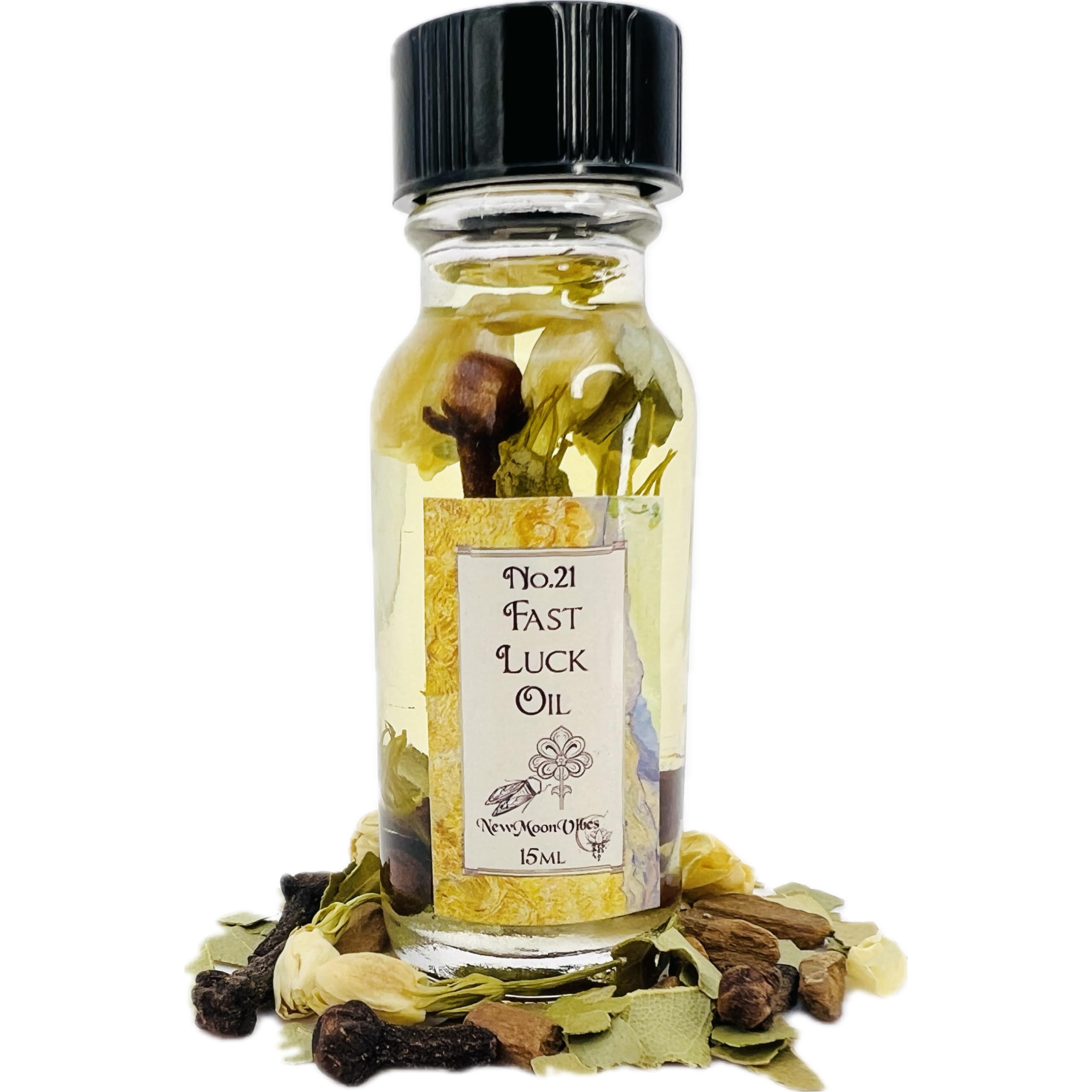 Introducing our Fast Luck Oil, a potent blend designed to usher in a wave of fortune and rapid success. Crafted with care, each ingredient in this 1 2 oz glass bottle has been selected for its powerful spiritual properties, contributing to an aura of positivity and prosperity. Ingredients Spiritual Intentions: - Cinnamon: Known for its ability to attract success, wealth, and healing, cinnamon is a powerhouse in spells for prosperity. - Bay Leaves: Symbolizing wisdom and protection, bay leaves are believed to manifest wishes and provide guidance on your path to success. - Cloves: Associated with protection and the banishment of negative energies, cloves help clear the way for good fortune. - Jasmine: Celebrated for its ability to inspire prophetic dreams and attract spiritual love, jasmine adds a layer of divine luck and intuition. Product Highlights: - Each bottle contains a carefully measured blend of cinnamon, bay leaves, cloves, and jasmine, promising a unique synergy for fast-acting luck. - Packaged in a 1 2 oz glass bottle, ensuring the freshness and potency of the blend is perfectly preserved for your use. - Designed for a range of spiritual practices, this oil is a versatile tool in your quest for rapid fortune and success. Suggested Uses: 1. Anointing Doors and Windows: Apply a small amount to thresholds to invite positive energy and luck into your home. 2. Dressing Talismans: Anoint your favorite talisman or amulet to enhance its luck-drawing power. 3. Enhancing Financial Documents: Lightly dab on bills, lottery tickets, or business cards to attract wealth and opportunities. 4. Preparation for Important Events: Apply to objects or symbols related to upcoming events for a favorable outcome. 5. Creating a Luck-Drawing Bath: Mix a few drops into a bath before significant endeavors to cleanse your aura and attract fortune. Affirmation Usage: Recite the following affirmation while using the Fast Luck Oil to maximize its efficacy: "Fortune flows freely to me, bringing rapid success and prosperity in all my endeavors." Use this affirmation especially before engaging in any of the suggested practices or whenever you feel the need to attract a quick turn of luck. Sold as a Curio: Our Fast Luck Oil is intended for external use only and is sold as a curio. It's a spiritual aid to complement your rituals and intentions, not a substitute for legal, medical, or financial advice. Embrace the possibility of swift changes and the manifestation of your desires with our Fast Luck Oil—your companion for attracting the quick turn of fortune you seek.New Moon Vibes handcrafted creation made to enhance your intentions. Infused with Real Herbs and Essential Oils. These oils enhance manifestation and intuition, magnifying intentions while nurturing a profound bond with nature and the spiritual realm. They enrich meditation, deepening one's connection to the divine. Cinnamon, known for its warm aroma, is said to bring prosperity and success, enhancing energy. Bay leaves, representing wisdom, aid in wish manifestation and protection, offering clarity. Cloves, with their strong protective traits, repel negativity and attract fortune. Jasmine, sweet and calming, encourages love and emotional healing, opening the heart to blessings and positive relationships. Our Fast Luck Oil is meticulously handcrafted fresh upon each order, guaranteeing the vibrancy and potency of every ingredient is ideally maintained for your spiritual endeavors. This oil is not merely a blend of essential oils and genuine herbs it is also imbued with positive intentions and blessings tailored to foster quick turns of fortune. Its carefully curated composition offers a powerful energetic signature designed to enhance your path towards attracting swift luck and favorable outcomes.