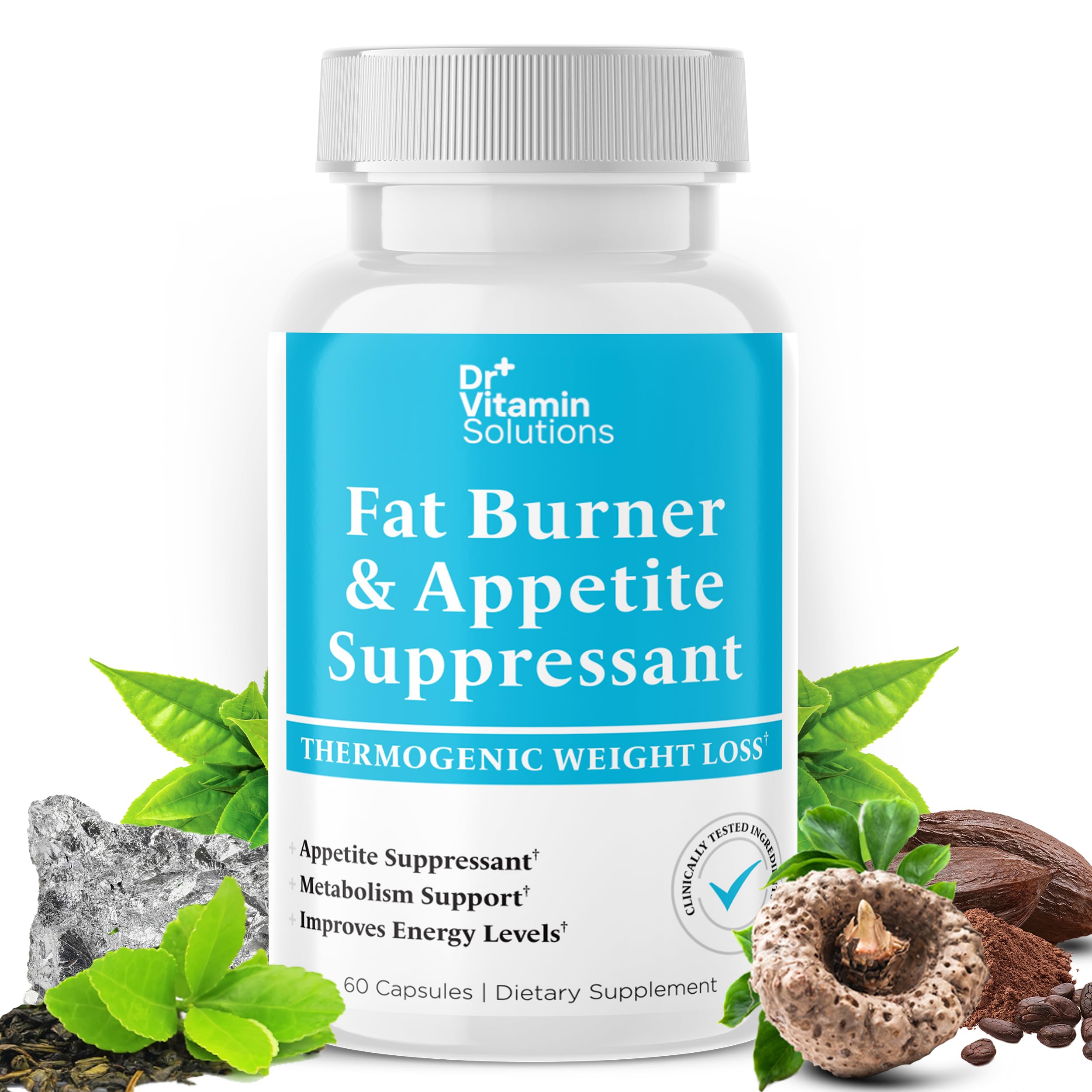 Trusted Quality: Made for fitness enthusiasts and individuals on a weight loss journey, our thermogenic fat burner for men and women are meant to be used in conjunction with a healthy diet and exersize. Comes with 60 easy-to-swallow capsules. These supplements are formulated in the USA in a GMP-certified facility. Clinically Tested, Non-GMO Diet Pills: This weight loss supplement for men features Hoodia Gordonii, Caralluma Fimbriata, Pomegranate, Guggul, Caffeine Anhydrous, and many more. Every component is selected to ensure maximum impact and trusted results. Promotes an effective way to lose weight in conjunction with a healthy diet and exercise. Metabolism Support for All-Day Energy: Boost your metabolism with our belly fat burner for women and men, featuring Caffeine and Theobromine. Experience steady energy without jitters or crashes, helping you stay energized and focused throughout the day. Suppress Hunger Cravings: Fight cravings head-on with our advanced blend appetite suppressant for weight loss. Glucomannan promotes fullness, helping you manage portion sizes and calorie intake effortlessly, ensuring steady weight loss progress. Effortless Fat-Burning Support: Simplify your weight loss journey with Dr. Vitamin's fat burner and appetite suppressant supplements. With Green Tea Extract and Guarana, accelerate your body's conversion of stored fat into energy, promoting efficient calorie burning.