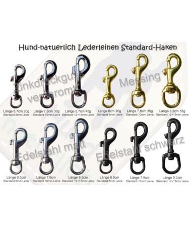 Suitable for every breed of dogs and dogs - dog, of course, fat leather linen always have a suitable hook to the linen width.We recommend up to a body weight of 10 kg 8mm, 10 - 20 kg 10mm, 20 - 35 kg 12mm, from 35 kg 15mm.High -quality bolt hooks - optionally made of chrome -plated zinc die cast in silver -colored or full -measurement hooks with a strong pen in gold -colored.Brass does not rust even after daily use in wind and weather and is a good alternative to stainless steel.Of course, our carabiners have a 360 rotary joint so that the leash does not turn.100 real, soft cowhide - our easy -care fat leather lines are made of one piece of leather and are therefore particularly stable.Due to the light oiling, fat leather lines are slightly water -repellent and do not need special care, slightly oiling after a few years if necessary, please do not grease, that makes the leash greasy and closes the pores.Robust, elegant and pleasant in the hand - our fat leather linen are drained by hand that the edges are hot so that the leash does not cut in hand and is particularly soft.The simple, braided style is timeless and to match any fur color.Made in Germany - Fat leather linen from dog, of course, have been made by hand in Germany for over 15 years.We only obtain our oiled fat leather from a German tannery.passend für jede Hunderasse und Hundegröße - Hund natürlich Fettlederleinen haben immer einen passenden Haken zur Leinenbreite. Wir empfehlen bis einem Körpergewicht von 10 KG 8mm, 10 - 20 KG 10mm, 20 - 35 KG 12mm, ab 35 KG 15mm. hochwertige Bolzenhaken - wahlweise aus verchromten Zinkdruckguss in silberfarben oder Voll-Messing Haken mit starker Feder in goldfarbig. Messing rostet auch nach täglichem Einsatz bei Wind und Wetter nicht und ist eine gute Alternative zu Edelstahl. Unsere Karabiner haben natürlich ein 360 Rotationsgelenk, damit sich die Leine nicht verdreht. 100 echtes, weiches Rindsleder - Unsere pflegeleichten Fettlederleinen werden aus einem Stück Leder gefertigt und sind somit besonders stabil. Durch die leichte Ölung sind Fettlederleinen leicht wasserabweisend und benötigen keine besondere Pflege, wenn nötig nach einigen Jahren leicht ölen, bitte nicht fetten, das macht die Leine schmierig und schließt die Poren. robust, elegant und angenehm in der Hand - Unsere Fettlederleinen werden von Hand ENTGRATET, dass heiß die Kanten sind gebrochen, damit die Leine nicht in der Hand schneidet und besonders weich ist. Der schlichte, geflochtene Stil ist zeitlos und passend zu jeder Fellfarbe. MADE in GERMANY - Fettlederleinen von Hund natürlich werden seit über 15 Jahren in Handarbeit in Deutschland hergestellt. Wir beziehen unser geöltes Fettleder ausschließlich aus einer deutschen Gerberei.Fettlederleine 1m 1,35m 2,20m 3m Chrom oder Messing ohne Handschlaufe (1m x 12mm schwarz Messing Haken) 1m x 12mm schwarz, Messing Haken