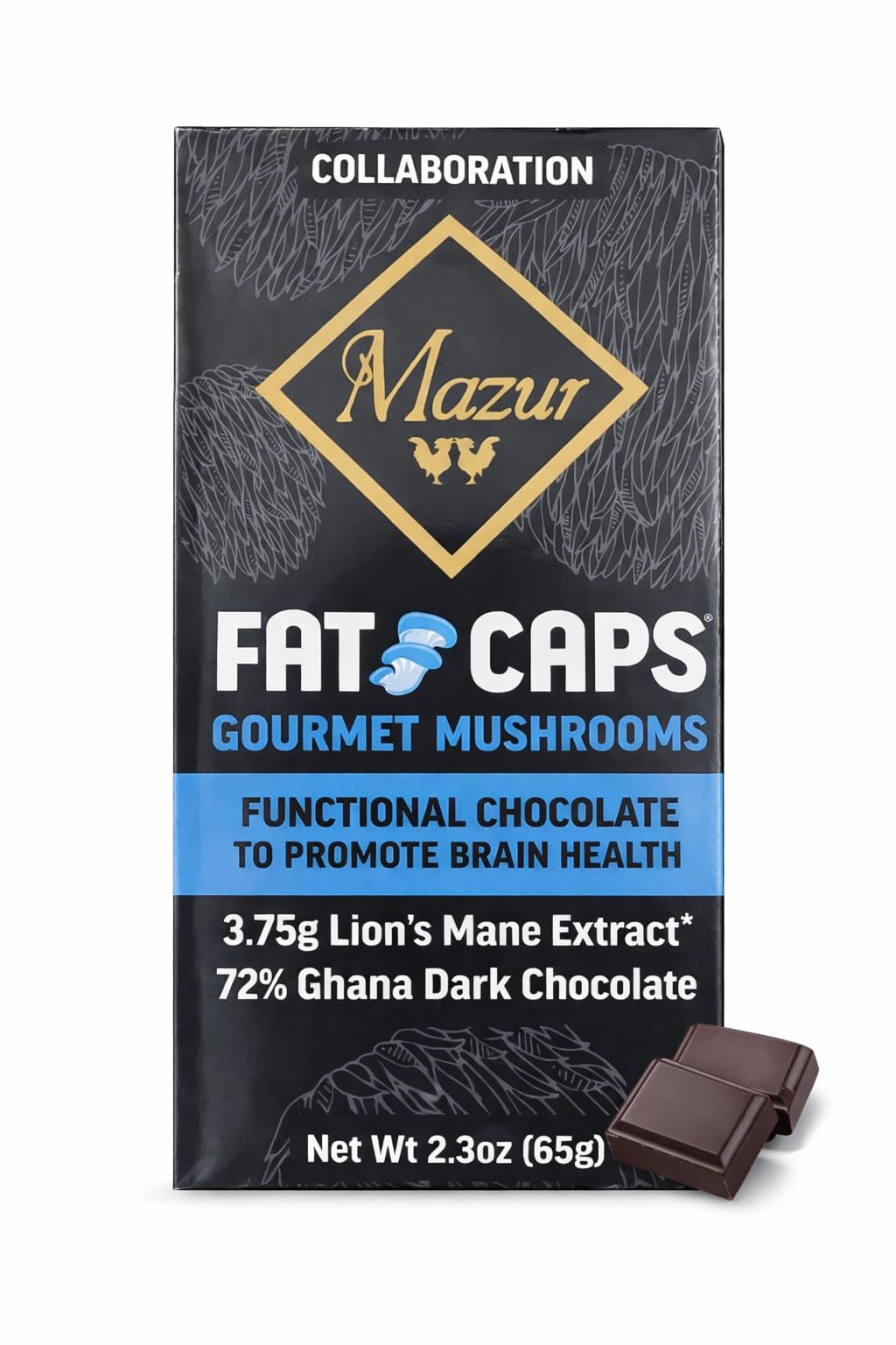 FatCaps Lion's Mane Dark Chocolate Bar blends the decadence of Mazur Dark Chocolate, made with 72 Ghana beans, and double extracted NJ spawned and grown Lion's Mane mushrooms. Made in New Jersey with 100 fruiting body, no grains or fillers, our Lion's Mane Bar provides you with the highest quality functional food for improved brain health, memory, and focus.