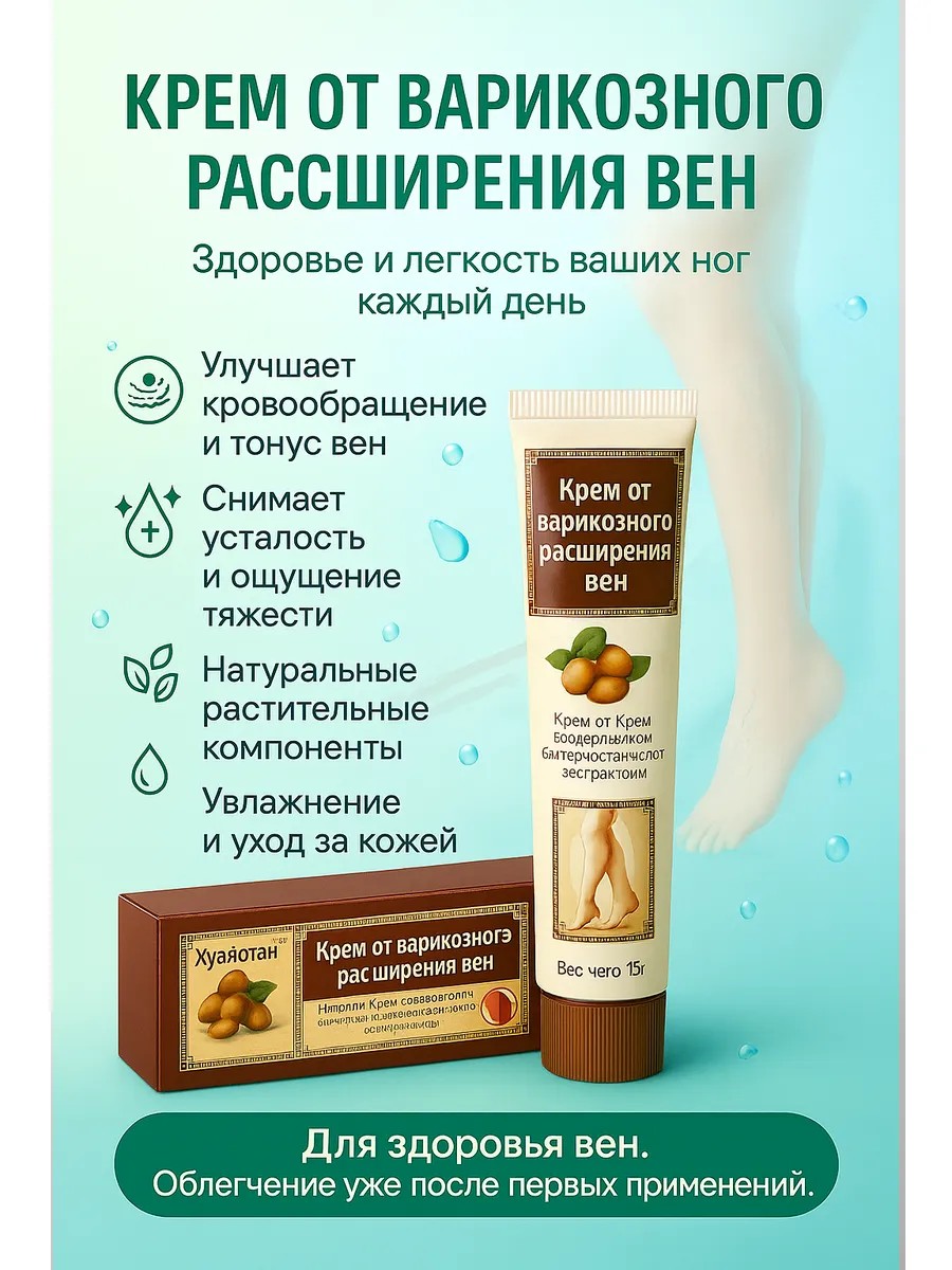 Huayaotang крем от варикозного расширения вен – топовый хит и настоящий лидер среди средств для ухода за ногами. Это не просто охлаждающий крем для ног, а современный гель с уникальным составом, который помогает справляться с варикозом, отеками, тяжестью и усталостью. Крем создан на основе растительных экстрактов, известных своими свойствами укреплять сосуды, улучшать микроциркуляцию и придавать ногам легкость. Благодаря формуле он действует мягко и эффективно, освежает, охлаждает и дарит чувство комфорта даже после самого напряженного дня.