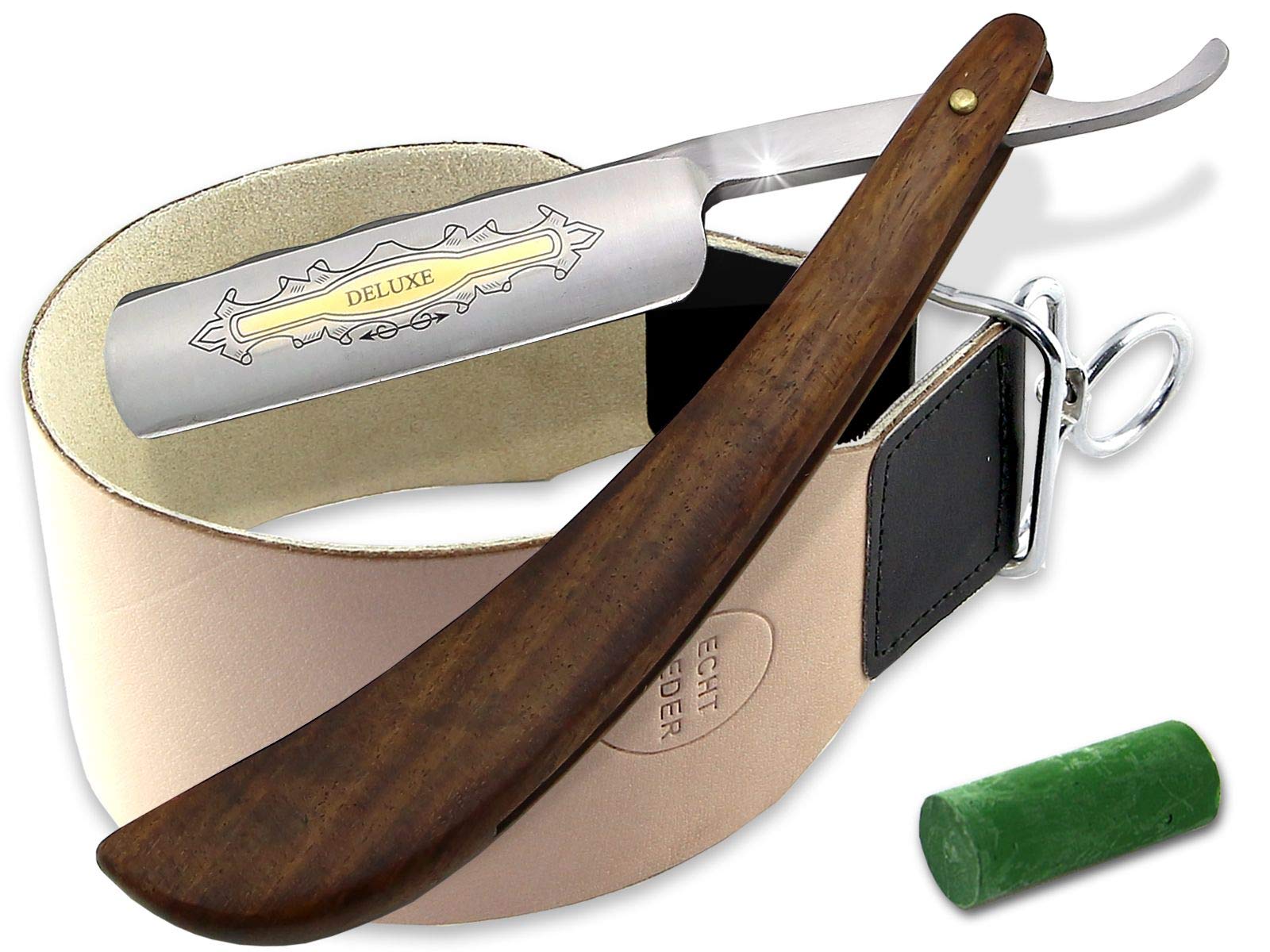 3-part razor set For men consisting of a grinding paste from Solingen, razor and a string string of instrument RW based in Germany.The pull -out leather was made by real leather by hand.This razor set is particularly suitable for beginners, beginners, beginners. A great razor set for classic shaving.A popular set as a gift for men, for example as a Christmas present, birthday present and Easter gift.No further costs, in contrast to interchangeable blades (razor blades must always be bought for expensive money), no further costs for razor blades in our cases.You can also achieve a thorough shave with our shaving knives. Razor with golden estate and brown real wood handle (booklet).Ergonomic handles.Very high quality.Hollow.Ideally suited for beginners.Blade height: approx. 2.1 cm (5/8 inches). Made (blade) made of razor steel. Extra wide professional string strap / pull -up leather.Real cowhide.Thanks to the width, the blade can be pulled off.Length: 49 cm.Width 7.5 cm.2 side: 1 page smooth and 1 made of suede.Optimal grinding property. Grinding paste from Solingen is used to support the grinding / sharpening process with the razor and leather straps. The use of our real leather string string ensures incredible results when sharpening razors.It is not for nothing that it is traditionally used to re -sharpen razor meters.Specialist trade quality of instrument rw based in Germany. GENERAL INFORMATION Shaving, wet shaving, shave, hand rasur, classic shave extra wide professional string straps as a tangent puller pull -off leather from fine soft beef.Real leather.Thanks to the width of the rest, the blade can be pulled off.With a narrow string string you have to carry out the sharpening process through the cross method, this can make the sharpening process more difficult.Professional quality.Total length: 49 cm.Width 7.5 cm.2 sides: one side made of real cowhide and one made of suede.One side is very fine, the other is slightly roughened.Razor with golden estate and brown real wood handle (booklet).Noble handle (booklet) variant made of wood.The back of the blade is extensively processed with hollows, a real highlight.The handle switches are ergonomically shaped.Very high quality.Easy to clean.The blade is hollow.Ideally suited for beginners.Blade length: 7.0 cm, blade height: approx. 2.1 cm (5/8 inches).Real manual work.Made (blade) made of razor steel.Premium quality from Solingen.Made in Germany.The paste has a fine grinding effect.It supports the pulling out during sharpening.With your new handmade razor you can improve yourself and your beard easily and precisely.You will notice your counterpart even more positively.Only when contours of your beard are trimmed clean, then it looks well -groomed and aesthetic.Gift idea.A great razor set for classic shaving.A popular set as a gift for men, for example as a Christmas present, birthday present and Easter gift. 3-Teiliges Rasiermesser-Set für Herren bestehend aus einer Schleifpaste aus Solingen, Rasiermesser und einem Streichriemen von InstrumenteNRW mit Sitz in Deutschland. Das Abziehleder wurde aus echtem Leder in Handarbeit hergestellt. Dieses Rasiermesserset ist besonders für Einsteiger, Anfänger, Beginner geeignet. Ein tolles Rasiermesser Set für die klassische Rasur. Ein beliebtes Set als Geschenk für Herren z.B. als Weihnachtsgeschenk, Geburtstagsgeschenk und Ostergeschenk. KEINE WEITEREN KOSTEN im Gegensatz zu Wechselklingenrasiermesser (Rasierklingen müssen da immer für teures Geld nachgekauft werden), bei unseren fallen keine weiteren Kosten für Rasierklingen an. Außerdem können Sie mit unseren Rasiermessern eine gründlicher Rasur erzielen. Rasiermesser mit Goldätzung und braunem Echt Holz Griff (Heft). Ergonomische Griffe. Sehr Hochwertig. Hohl geschliffen. Bestens geeignet für Anfänger. Klingenhöhe: ca. 2,1 cm (5/8 Zoll).Gefertigt (Klinge) aus Rasiermesserstahl. Extra breiter Profi Streichriemen / Abziehleder. Echtes Rindleder. Dank der Breite, kann die Klinge gerade abgezogen werden. Länge: 49 cm. Breite 7,5 cm. 2 Seitig: 1 Seite glatt und 1 aus Wildleder. Optimale Schleifeigenschaft. Schleifpaste aus Solingen dient zur Unterstützung des Schleif / Schärf Vorgangs mit dem Rasiermesser und Lederriemen. Die Nutzung unseres Echt Leder Streichriemens sorgt für unglaubliche Ergebnisse beim Schärfen von Rasiermesser. Nicht umsonst wird er traditionell zum Nachschärfen von Rasiermessern verwendet. Fachhandel Qualität von InstrumenteNRW mit Sitz in Deutschland. ALLGEMEINE ANGABEN Rasieren, Nassrasur, Rasur, Handrasur, Klassische RasurExtra breiter Profi Streichriemen als Hängeriemen Abziehleder Abziehriemen aus feinem weichen Rindleder. Echtes Leder. Dank der Breite des Riemens, kann die Klinge gerade abgezogen werden. Bei einem schmalen Streichriemen muss man den Schärf Vorgang durch die Kreuz Methode durchführen, dies kann den Schärf Vorgang erschweren. Profi-Qualität. Gesamtänge: 49 cm. Breite 7,5 cm. 2 Seitig: Eine Seite aus echtem Rindleder und eine aus Wildleder. Eine Seite ist sehr fein, die andere leicht aufgeraut. Rasiermesser mit Goldätzung und braunem Echt Holz Griff (Heft). Edle Griff (Heft) Variante aus Holz. Der Klingenrücken ist aufwendig mit Mulden verarbeitet, ein echtes Highlight. Die Griffschalten sind ergonomisch geformt. Sehr Hochwertig. Leicht zu reinigen. Die Klinge ist hohl geschliffen. Bestens geeignet für Einsteiger. Klingenlänge: 7,0 cm, Klingenhöhe: ca. 2,1 cm (5/8 Zoll). Echte Handarbeit. Gefertigt (Klinge) aus Rasiermesserstahl. Premium-Qualität aus Solingen. Made in Germany. Die Paste hat einen feinen Schleifeffekt. Sie unterstützt die Abziehwirkung während des Schärfens. Mit Ihrem neuen handgefertigten Rasiermesser können Sie leicht und präzise sich und Ihren Bart verbessern. Deinem Gegenüber werden Sie noch positiver auffallen. Nur wenn Konturen Ihres Bartes sauber getrimmt sind, dann wirkt er gepflegt und ästhetisch. GESCHENK IDEE. Ein tolles Rasiermesser Set für 