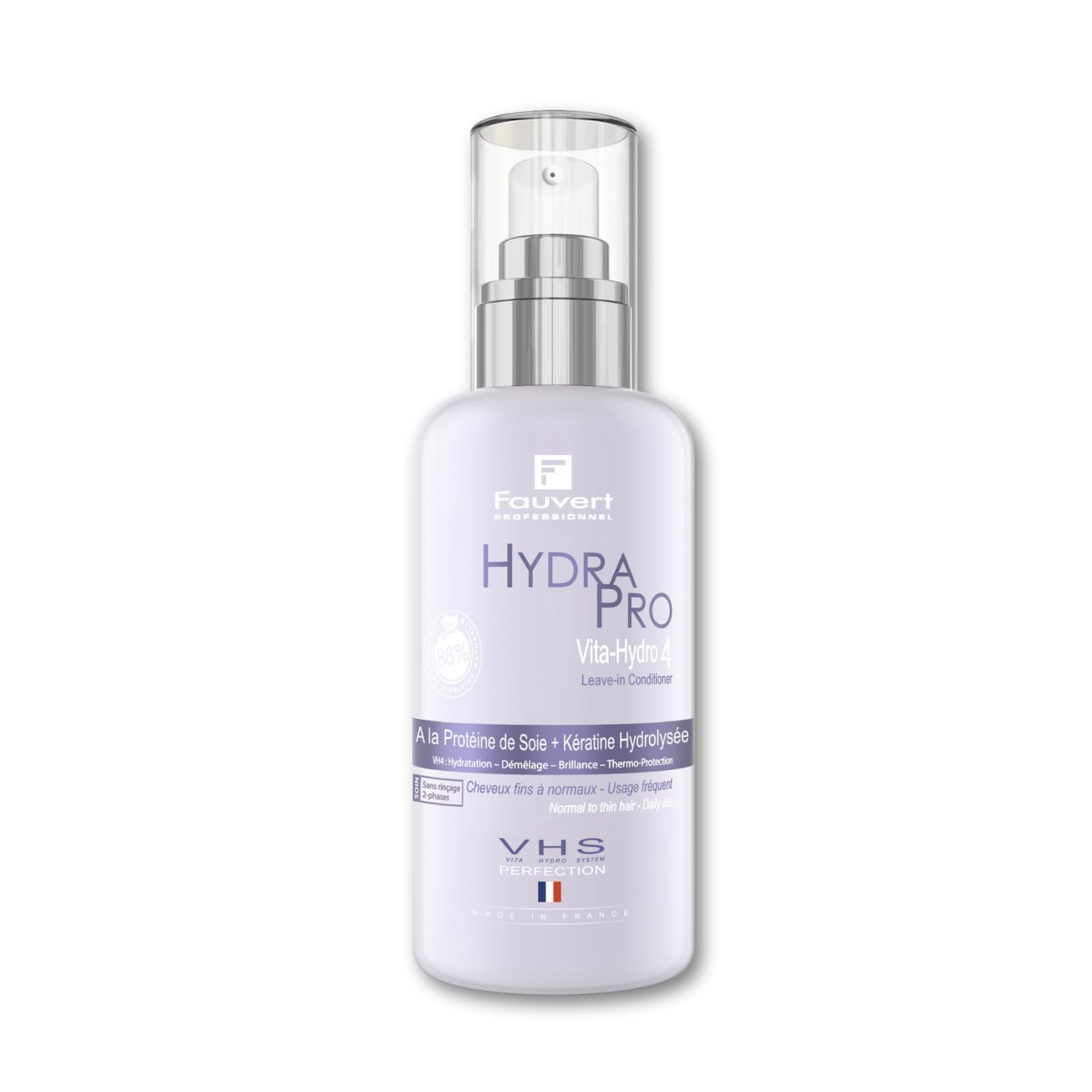 Fauvert 4-in-1 Bi-Phase Moisturizing Treatment. Rediscover strengthened, supple, shiny, and manageable hair. Combining the benefits of Hydrolyzed Keratin with Silk Proteins, the VH4 two-phase treatment is a concentrated innovation guaranteeing four key effects in a single step: it provides hydration, vitality, shine, and detangling assistance. Natural Active Ingredient: Silk Proteins: moisturizing, strengthening, and coating properties. Technological Active Ingredient: Hydrolyzed Keratin: intense repair and shine to the hair fiber. Application: Shake the bottle well before use to mix the two phases. Spray all over your hair. Do not rinse. In case of contact with eyes, rinse immediately with water. Volume: 200ml INSTRUCTIONS FOR USE Shake the bottle before use, spray all over your hair, do not rinse.