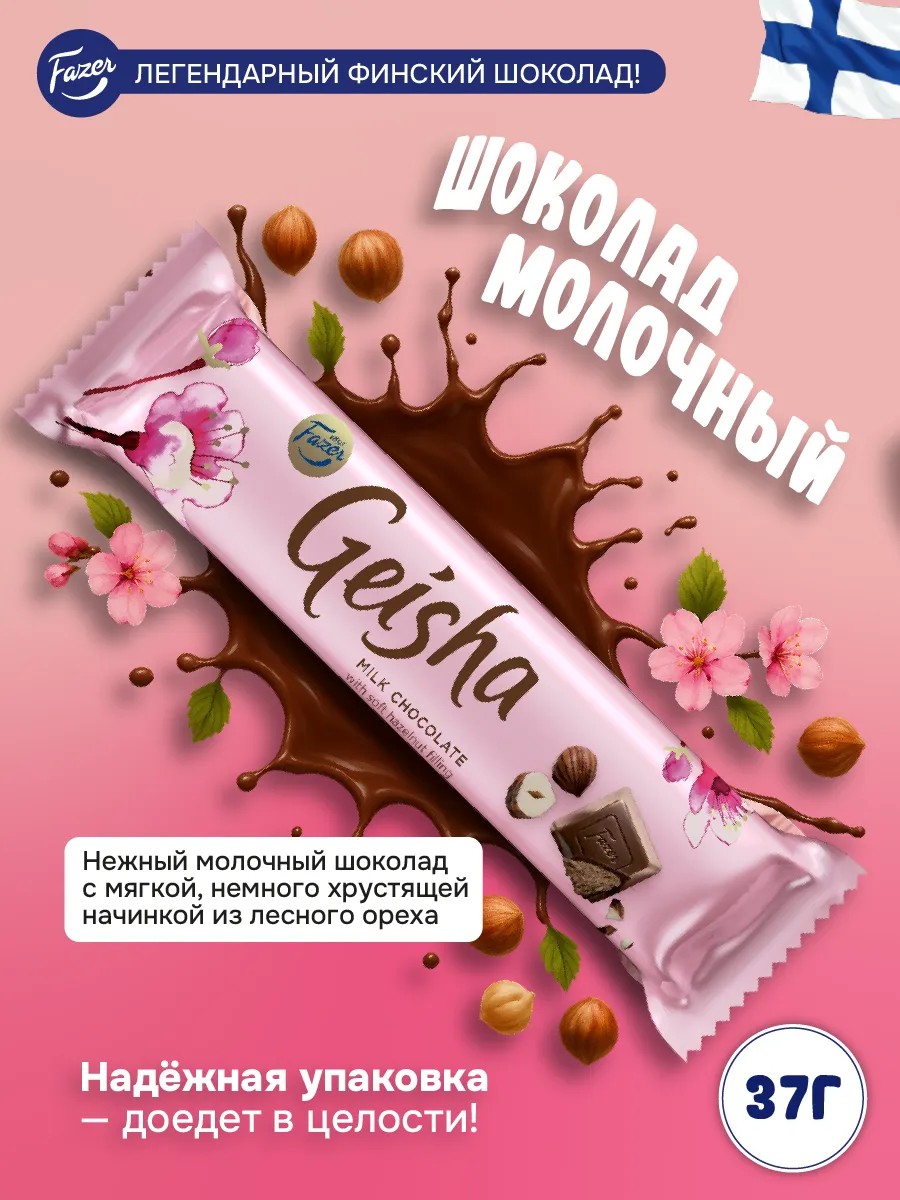 Geisha — это не просто плитка шоколада, а целая история вкуса. Молочный шоколад премиального качества обволакивает начинку из нежной лесной ореховой нуги с лёгким хрустом — идеальное сочетание, в котором каждый ингредиент играет свою роль.